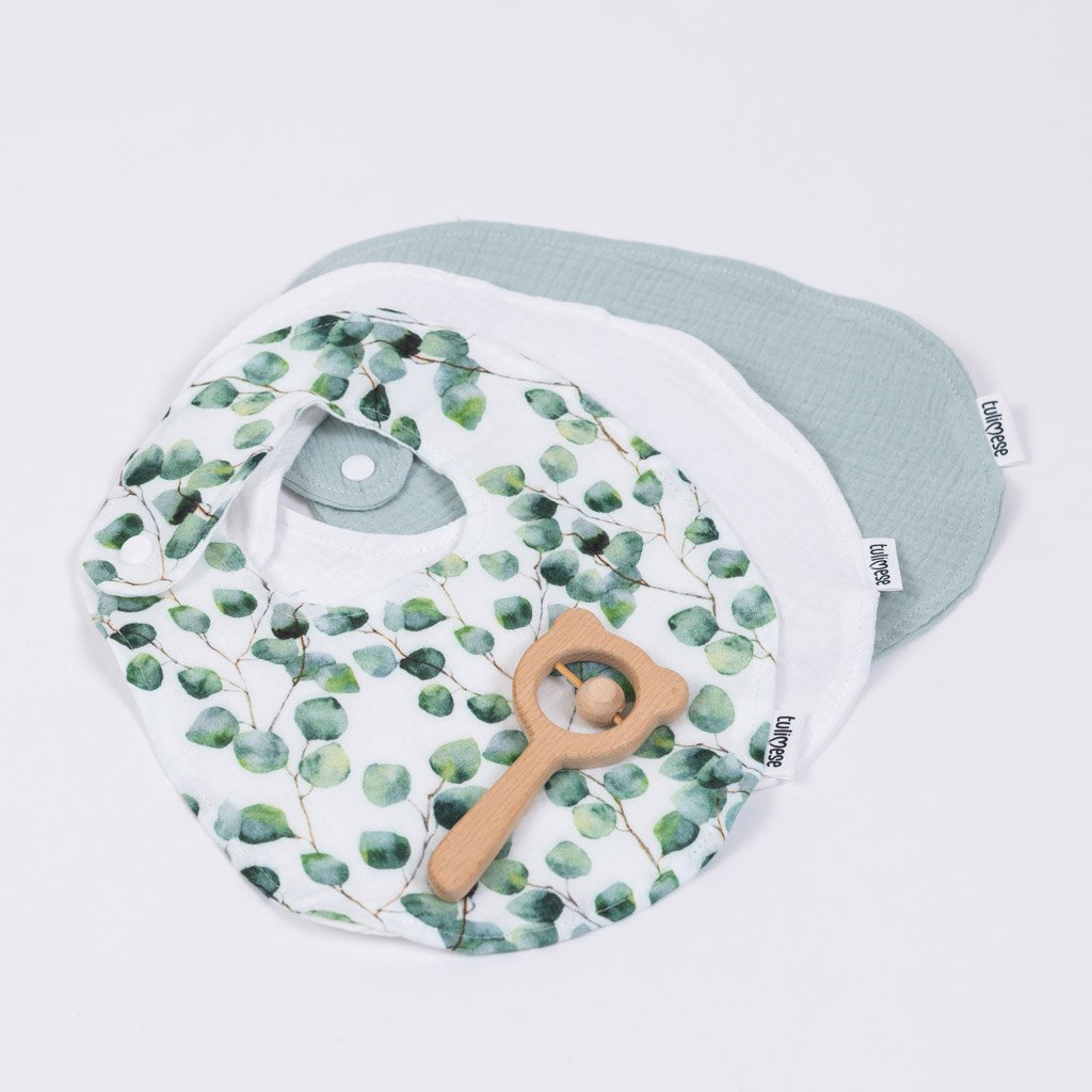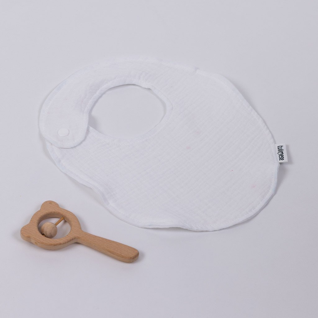 Jemný mušelínový bryndáček sloužící k nakrmení, napití nebo jen k odříhnutí miminka. Možno použít i jako slintáček v období růstu zoubků. Chrání oděv miminka před znečištěním. Vhodný pro děti od 4 měsíců do 1,5 roku - dítě je krmeno rodiči a není nutné používat gumové varianty bryndáků.