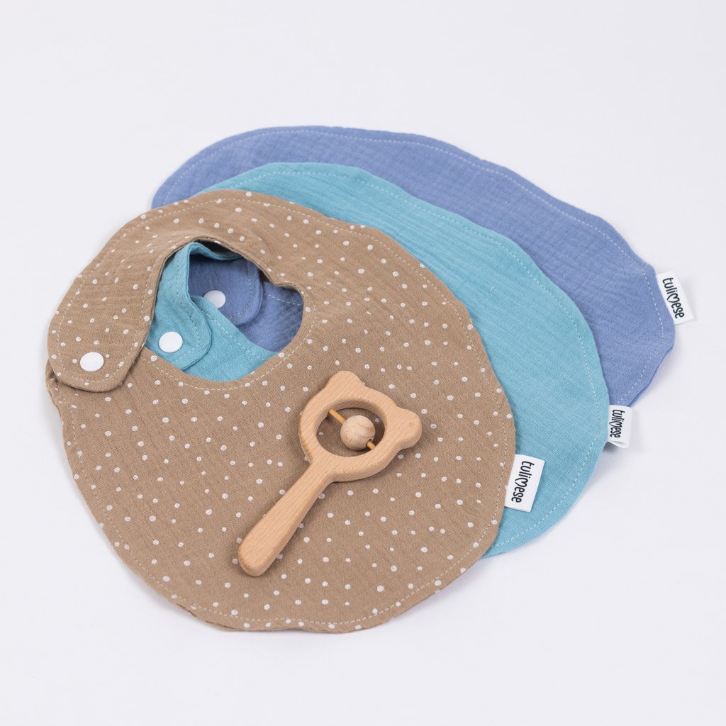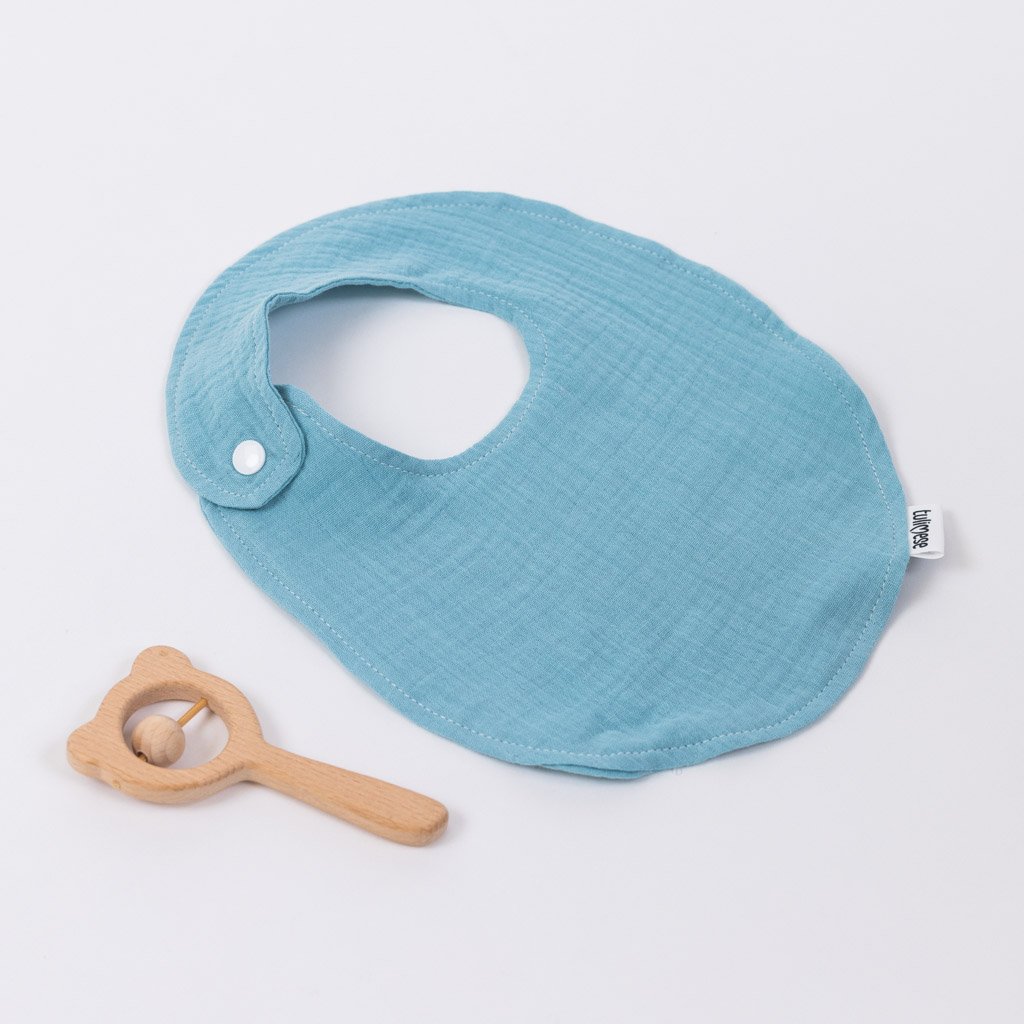 Jemný mušelínový bryndáček sloužící k nakrmení, napití nebo jen k odříhnutí miminka. Možno použít i jako slintáček v období růstu zoubků. Chrání oděv miminka před znečištěním. Vhodný pro děti od 4 měsíců do 1,5 roku - dítě je krmeno rodiči a není nutné používat gumové varianty bryndáků.