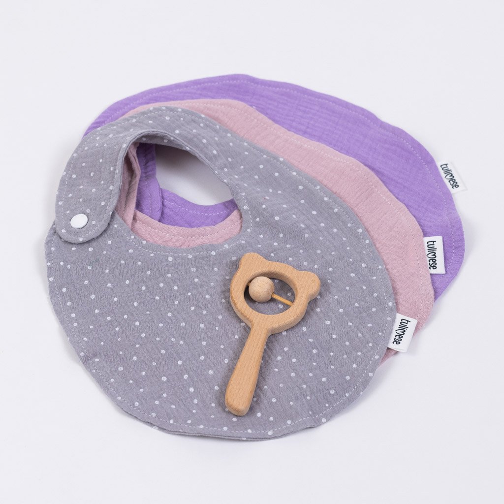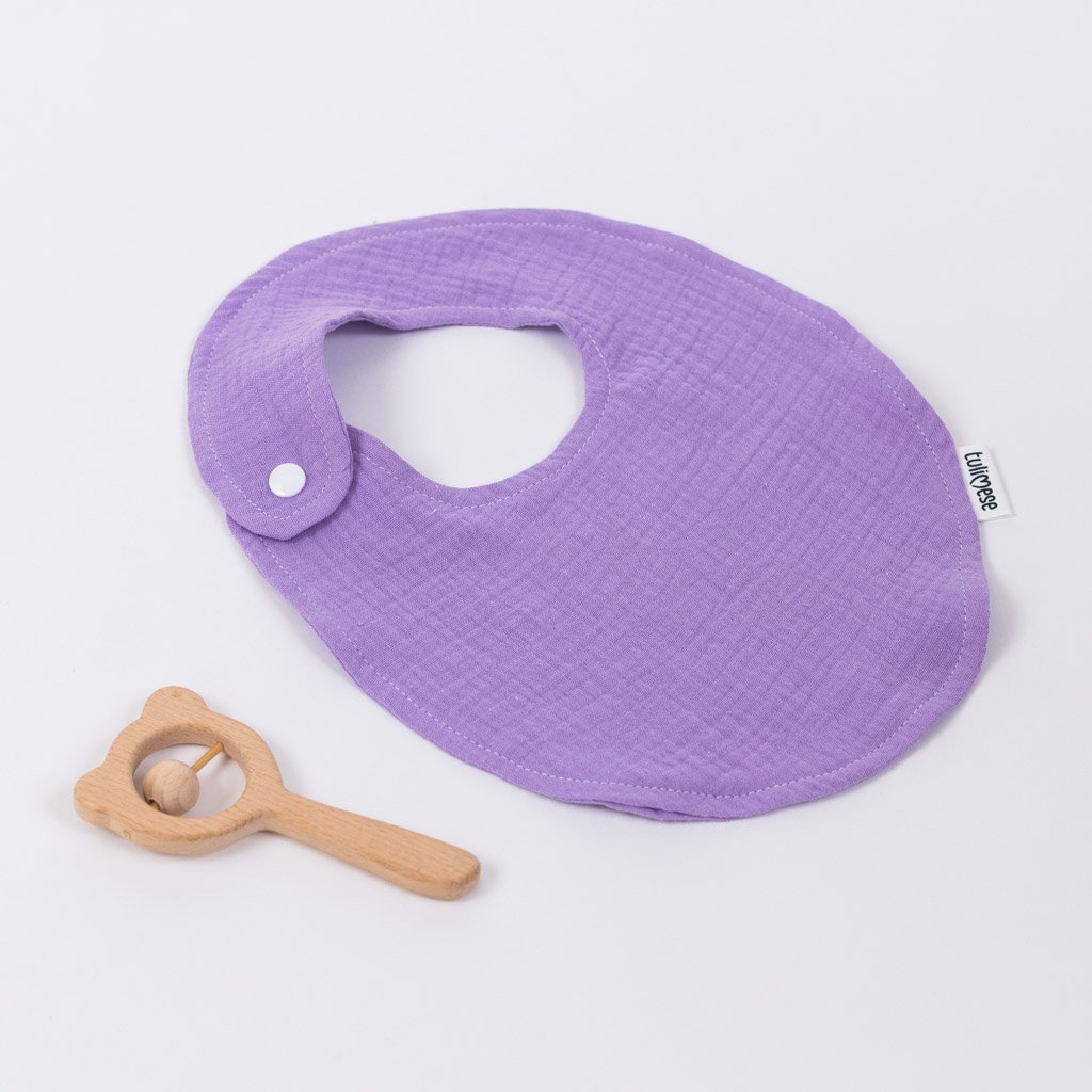 Jemný mušelínový bryndáček sloužící k nakrmení, napití nebo jen k odříhnutí miminka. Možno použít i jako slintáček v období růstu zoubků. Chrání oděv miminka před znečištěním. Vhodný pro děti od 4 měsíců do 1,5 roku - dítě je krmeno rodiči a není nutné používat gumové varianty bryndáků.