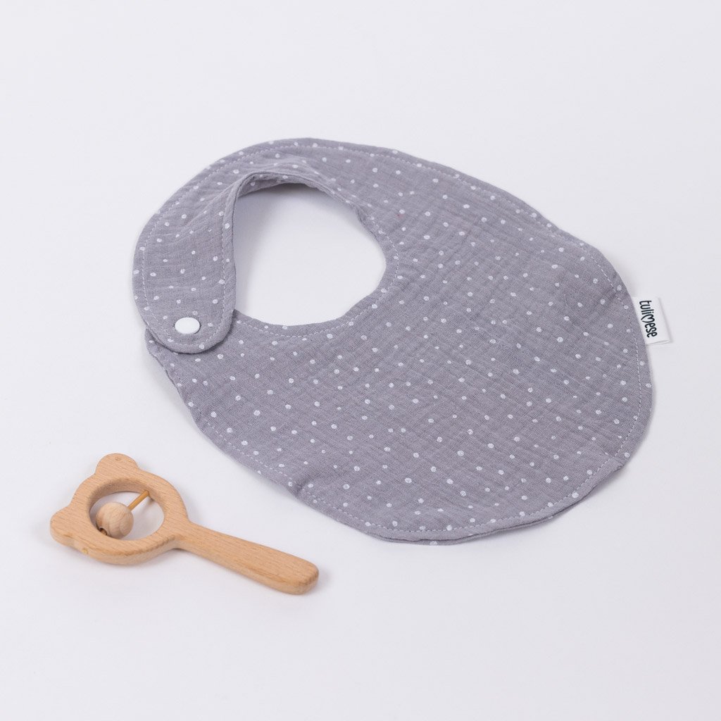Jemný mušelínový bryndáček sloužící k nakrmení, napití nebo jen k odříhnutí miminka. Možno použít i jako slintáček v období růstu zoubků. Chrání oděv miminka před znečištěním. Vhodný pro děti od 4 měsíců do 1,5 roku - dítě je krmeno rodiči a není nutné používat gumové varianty bryndáků.