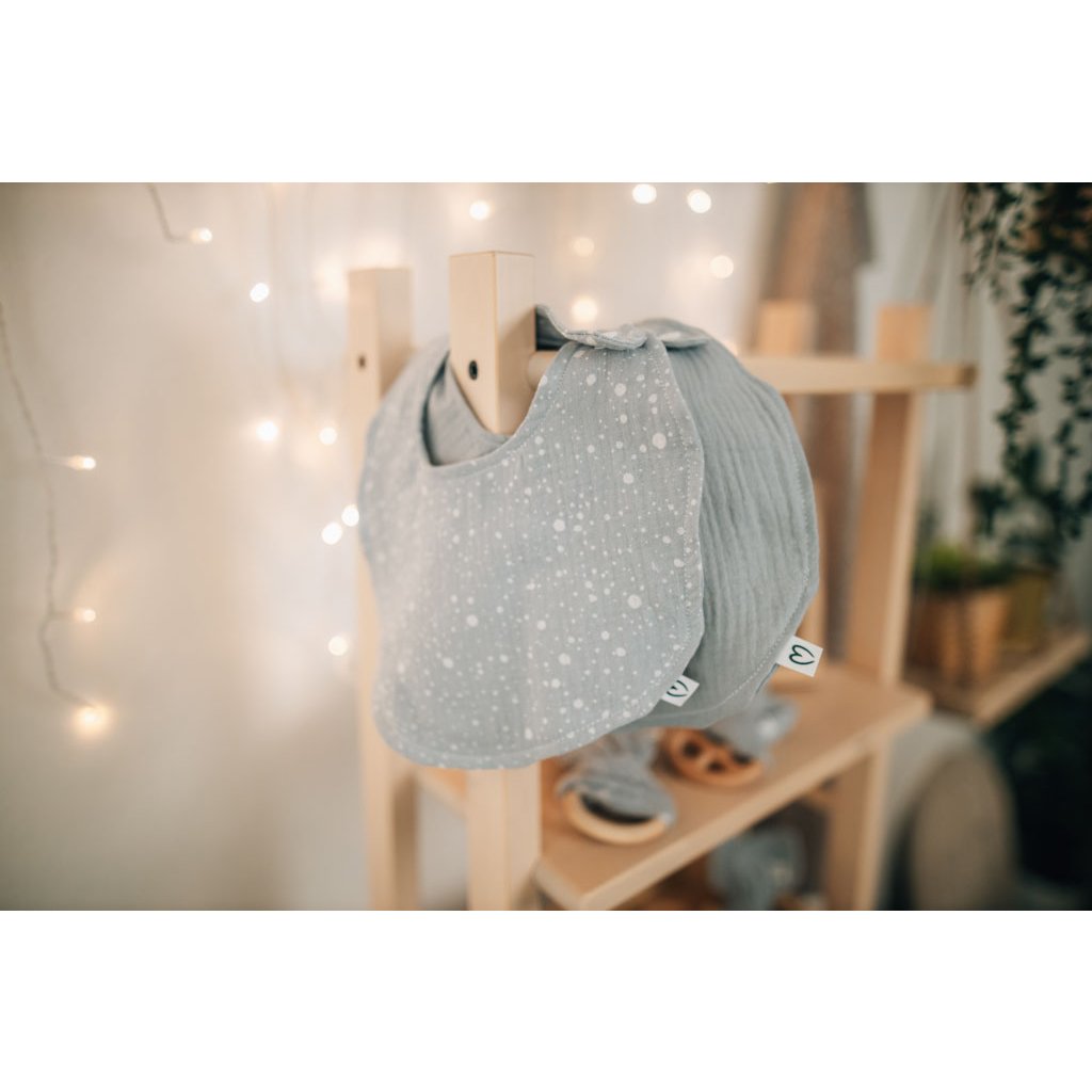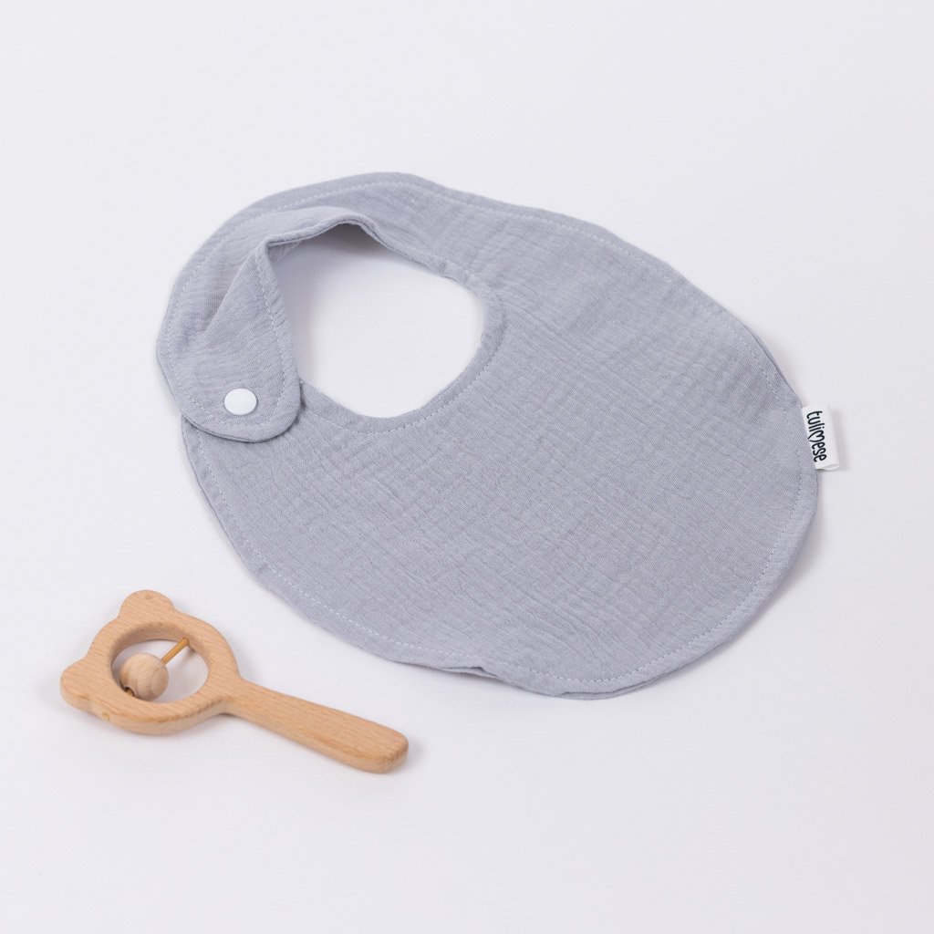 Jemný mušelínový bryndáček sloužící k nakrmení, napití nebo jen k odříhnutí miminka. Možno použít i jako slintáček v období růstu zoubků. Chrání oděv miminka před znečištěním. Vhodný pro děti od 4 měsíců do 1,5 roku - dítě je krmeno rodiči a není nutné používat gumové varianty bryndáků.