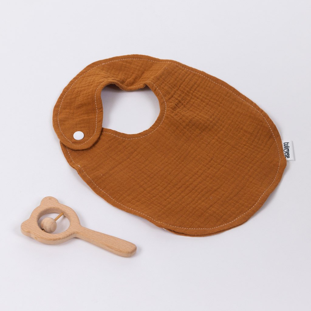 Jemný mušelínový bryndáček sloužící k nakrmení, napití nebo jen k odříhnutí miminka. Možno použít i jako slintáček v období růstu zoubků. Chrání oděv miminka před znečištěním. Vhodný pro děti od 4 měsíců do 1,5 roku - dítě je krmeno rodiči a není nutné používat gumové varianty bryndáků.
