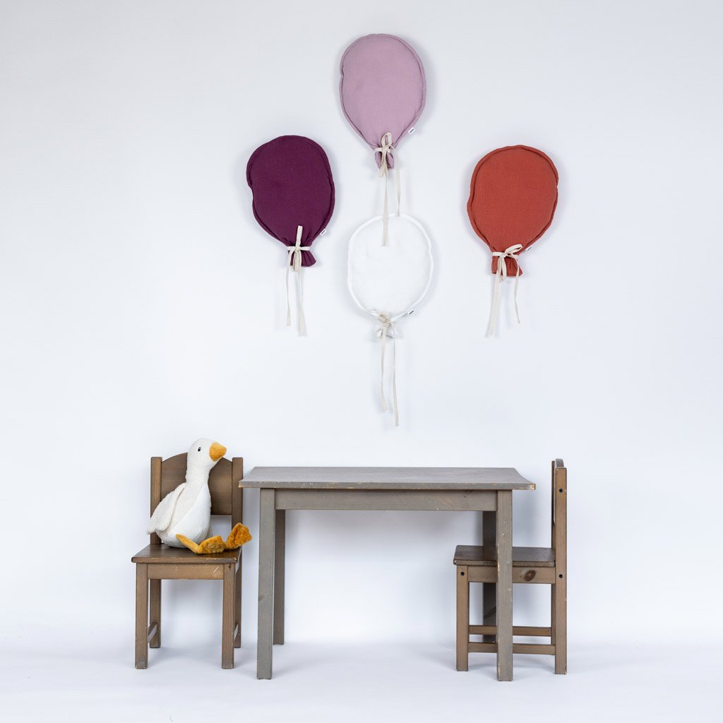 Dekorační nástěnný balónek k zútulnění každého dětského pokojíčku. Balónek šijeme z mušelínu v 15-ti barvách. Je vyplněn měkkou vatelínovou výplní a na zeď ho lze připevnit našitým suchým zipem. Spolu s dalšími výrobky z naši nabídky ve stejném barevném provedení vytvoříte elegantní a útulný pokojíček. Na balónek lze navíc vyšít jméno vašeho miminka, tak aby mělo vlastní prostor pro svůj růst a vývoj.
