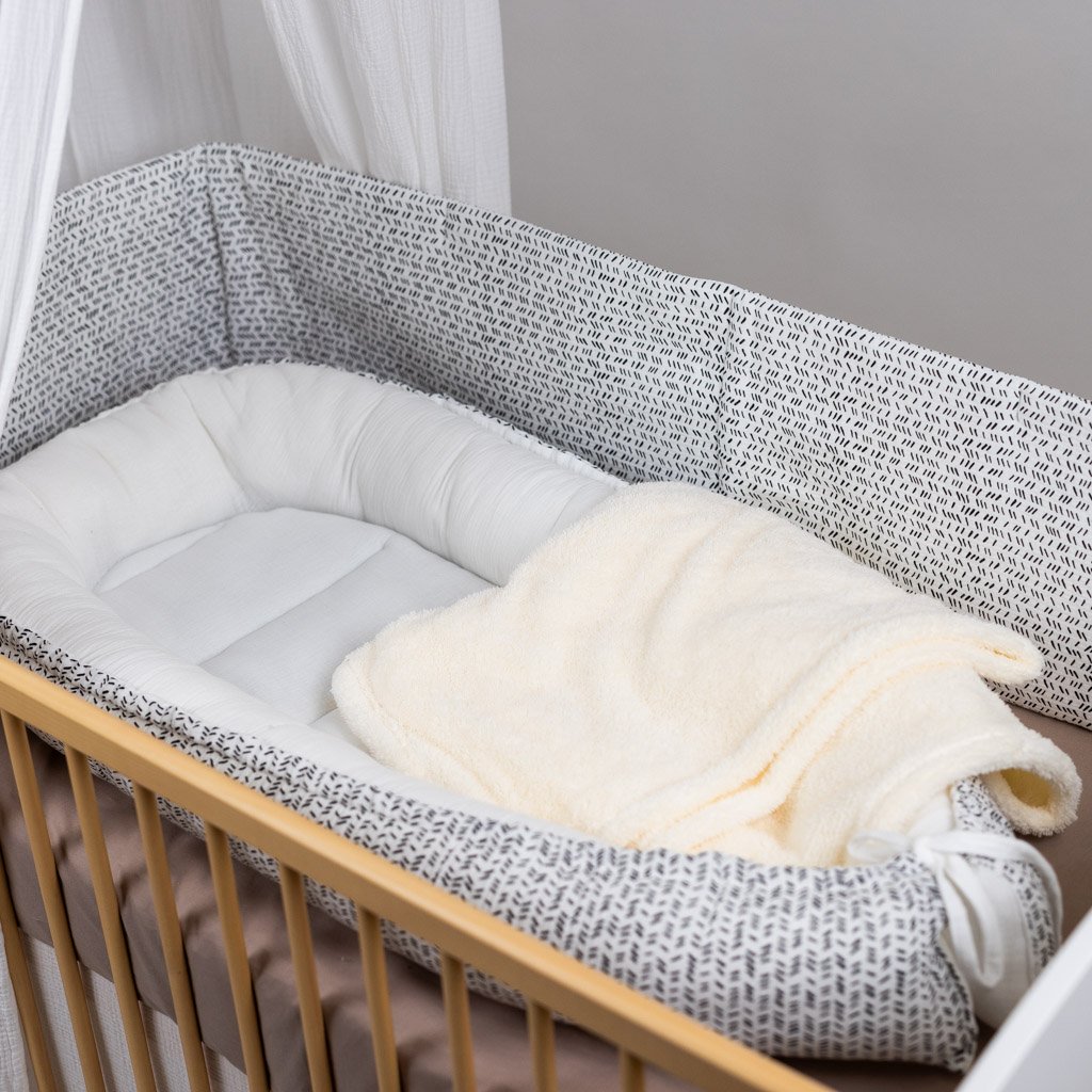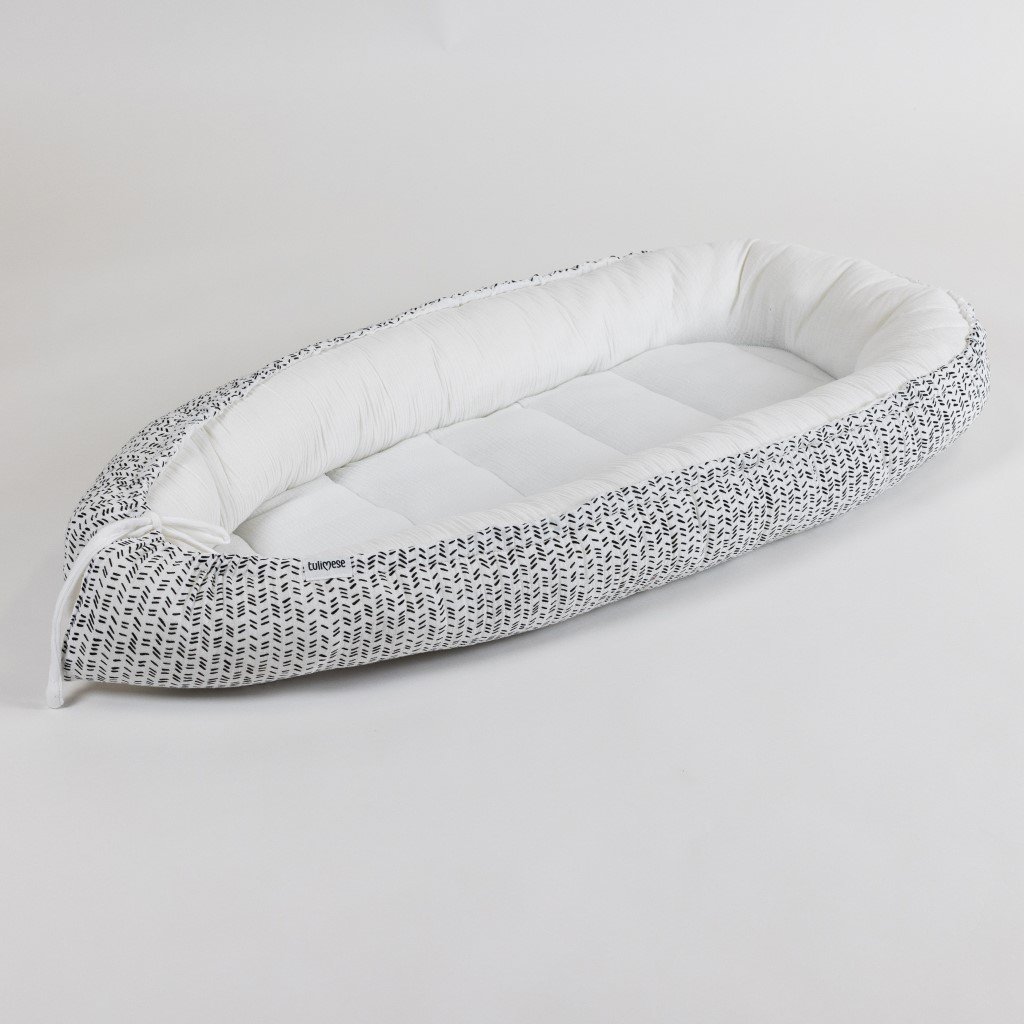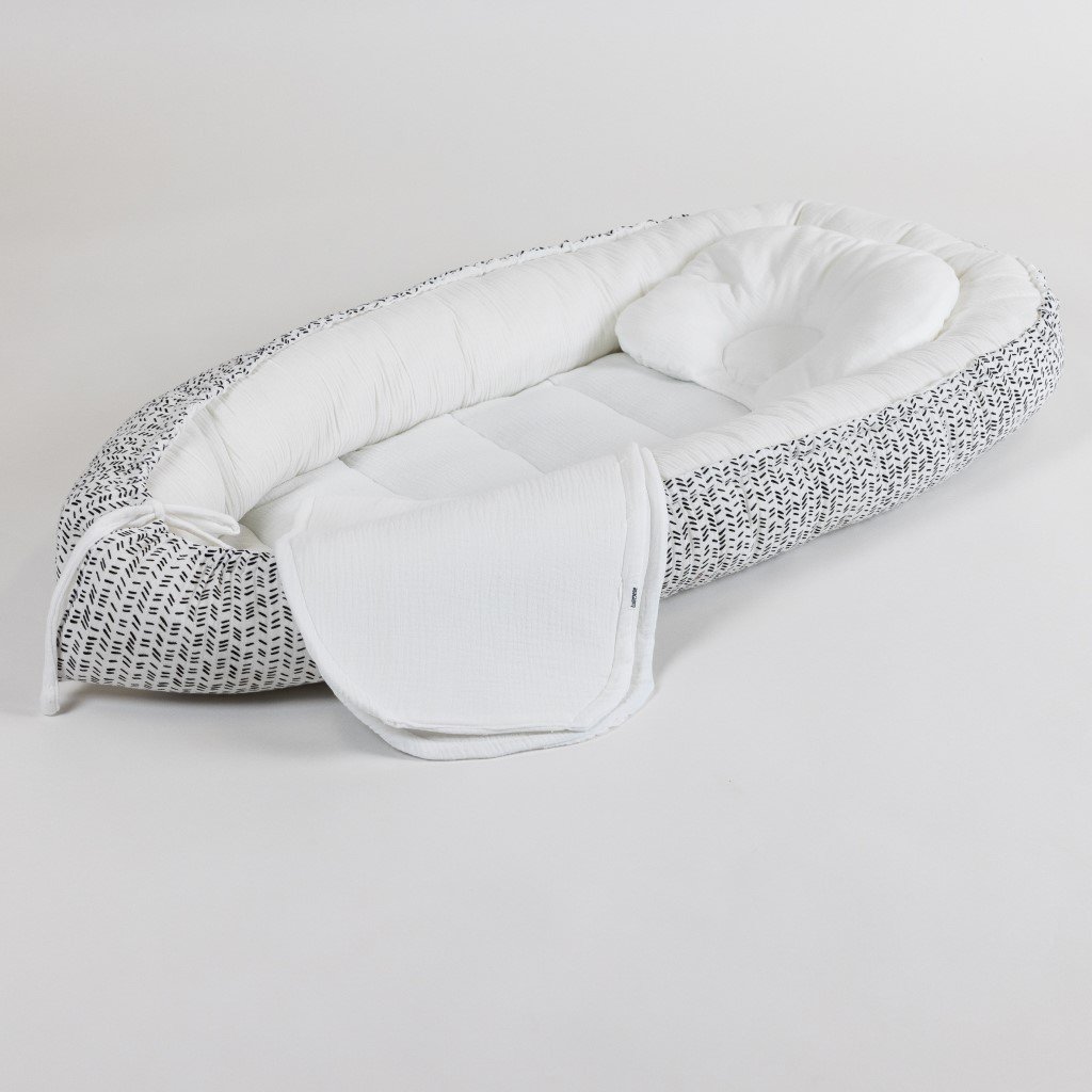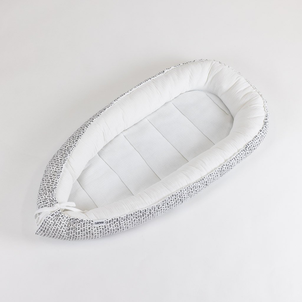 - Hnízdečko je součástí barevně sladěné sady výrobků pro miminko SADA MUŠELÍN ČÁRKY.