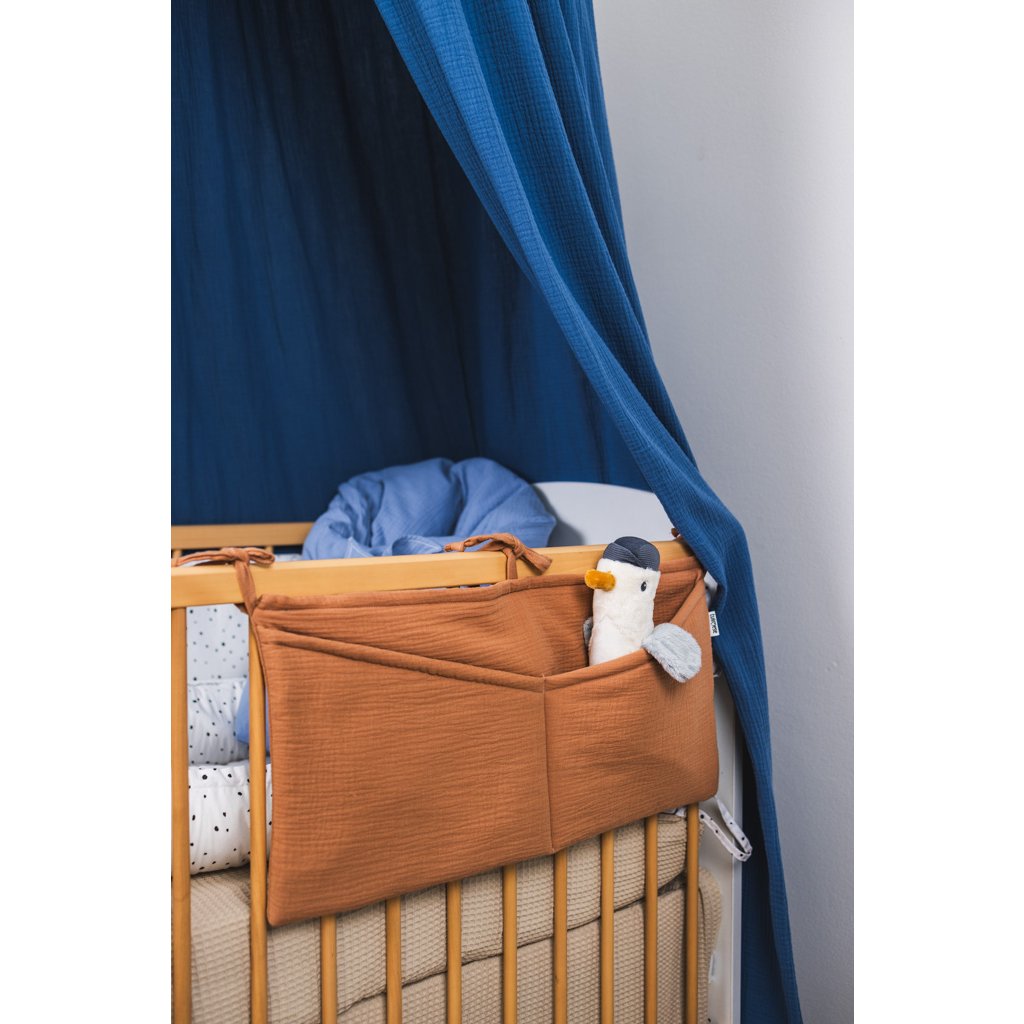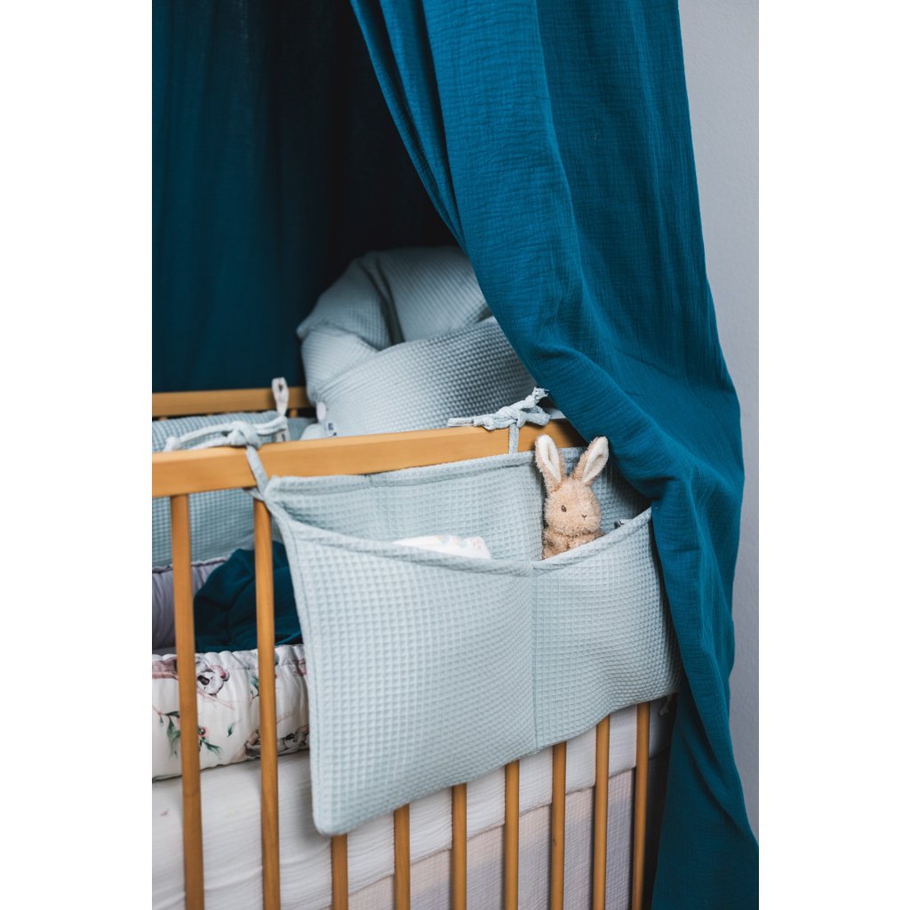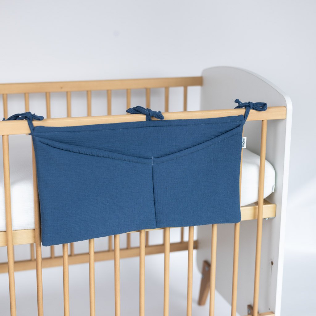 Praktický mušelínový kapsář v modré barvě. Kapsář je opatřen třemi tkanicemi. Je možné ho připevnit na postýlku pro miminko i na větší postel s dřevěnými bočnicemi. Kapsář je zpevněn vatelínovou výplní, kapsy dobře drží tvar a jsou velmi praktické na úschovu několika plenek, krémů, hraček, oblečení nebo knih.