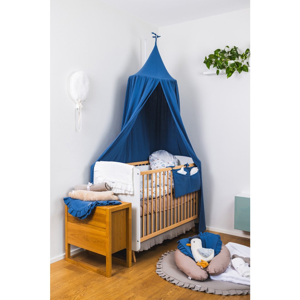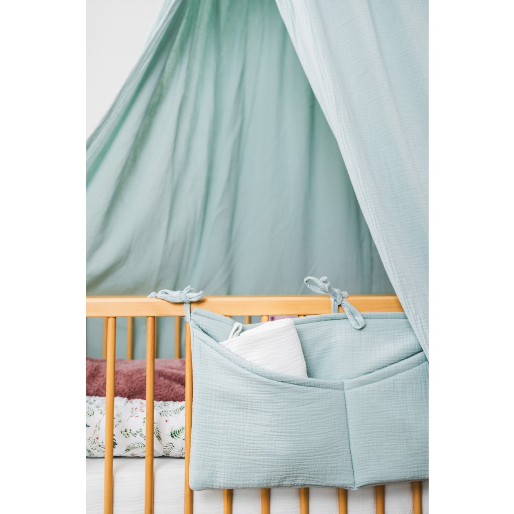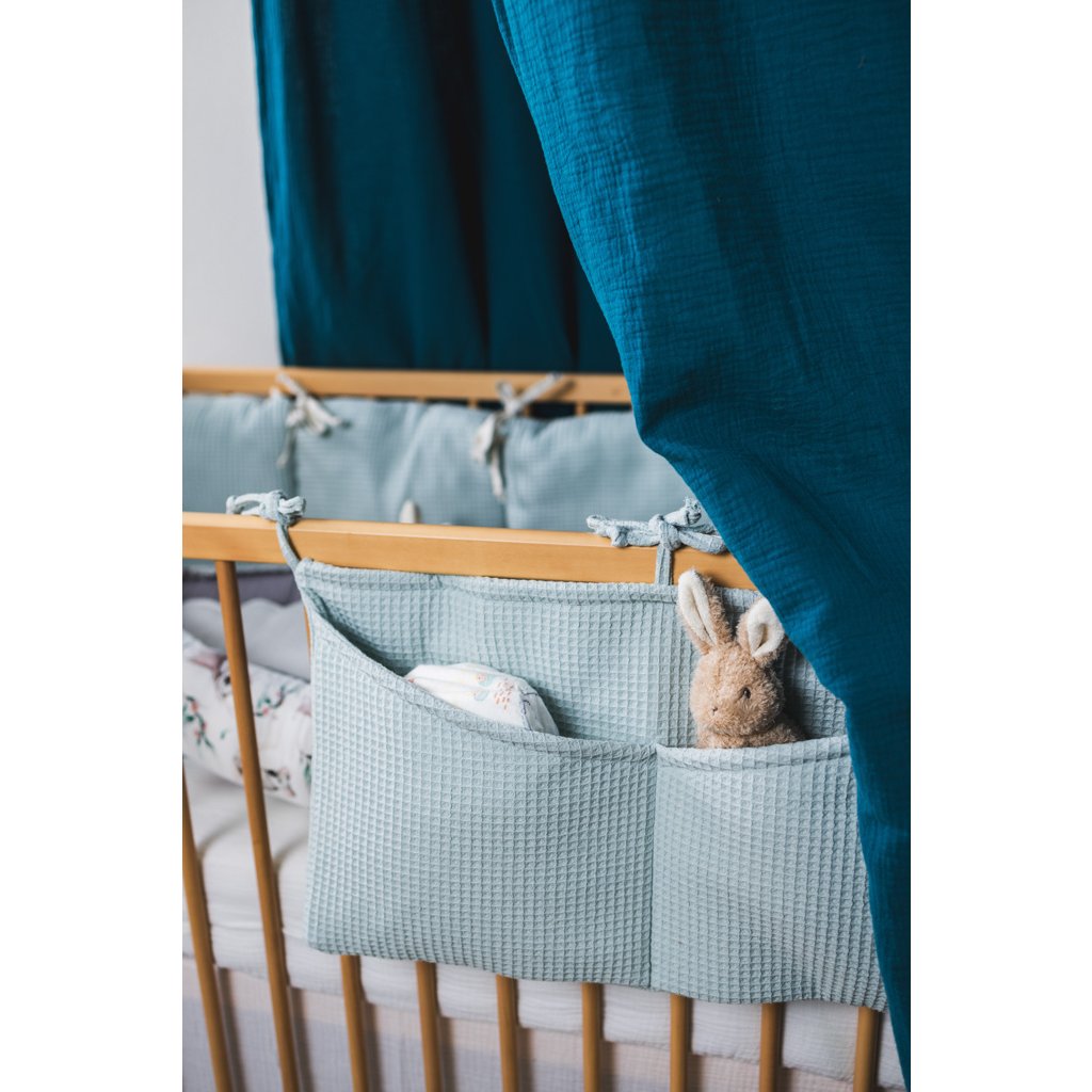 Praktický mušelínový kapsář v modré barvě. Kapsář je opatřen třemi tkanicemi. Je možné ho připevnit na postýlku pro miminko i na větší postel s dřevěnými bočnicemi. Kapsář je zpevněn vatelínovou výplní, kapsy dobře drží tvar a jsou velmi praktické na úschovu několika plenek, krémů, hraček, oblečení nebo knih.