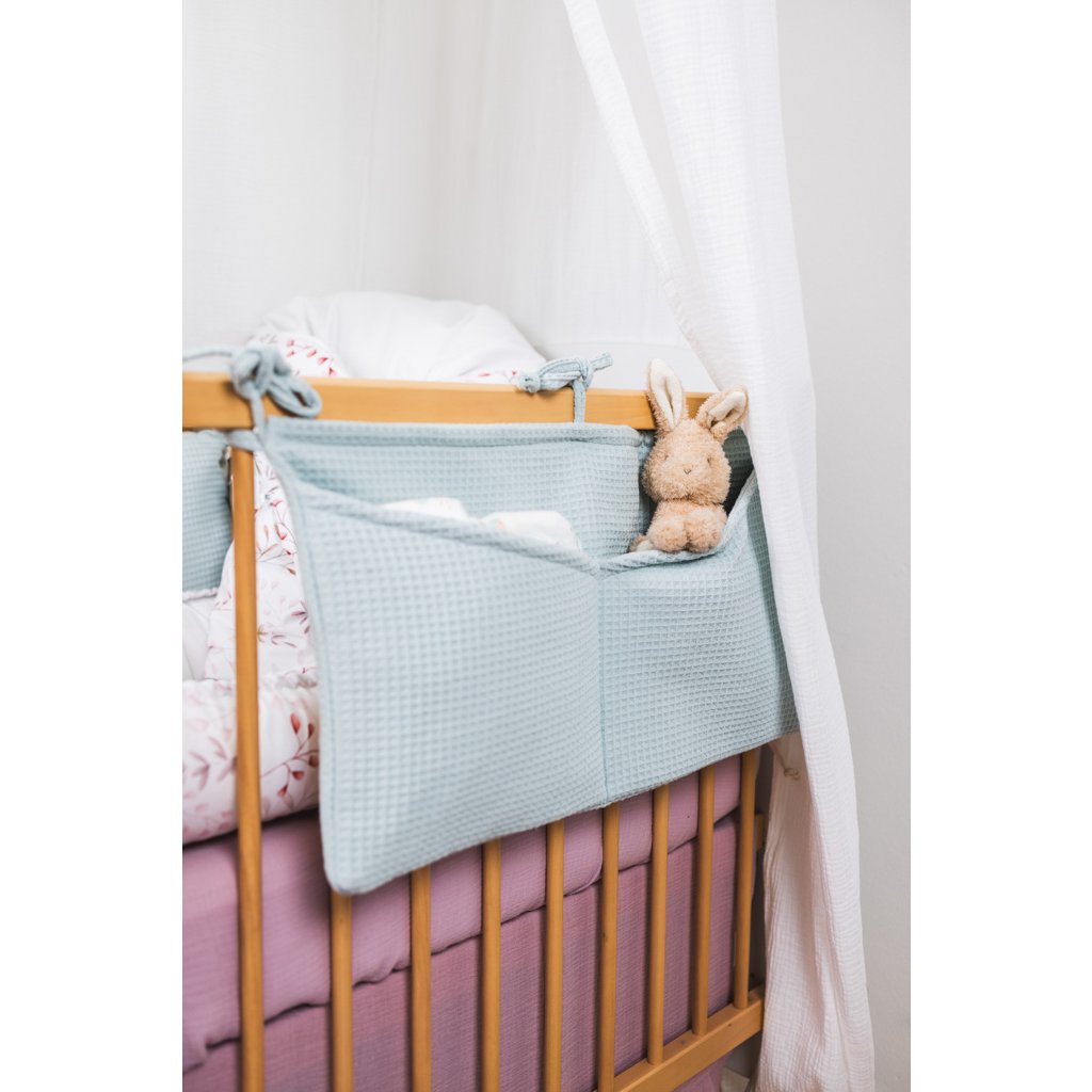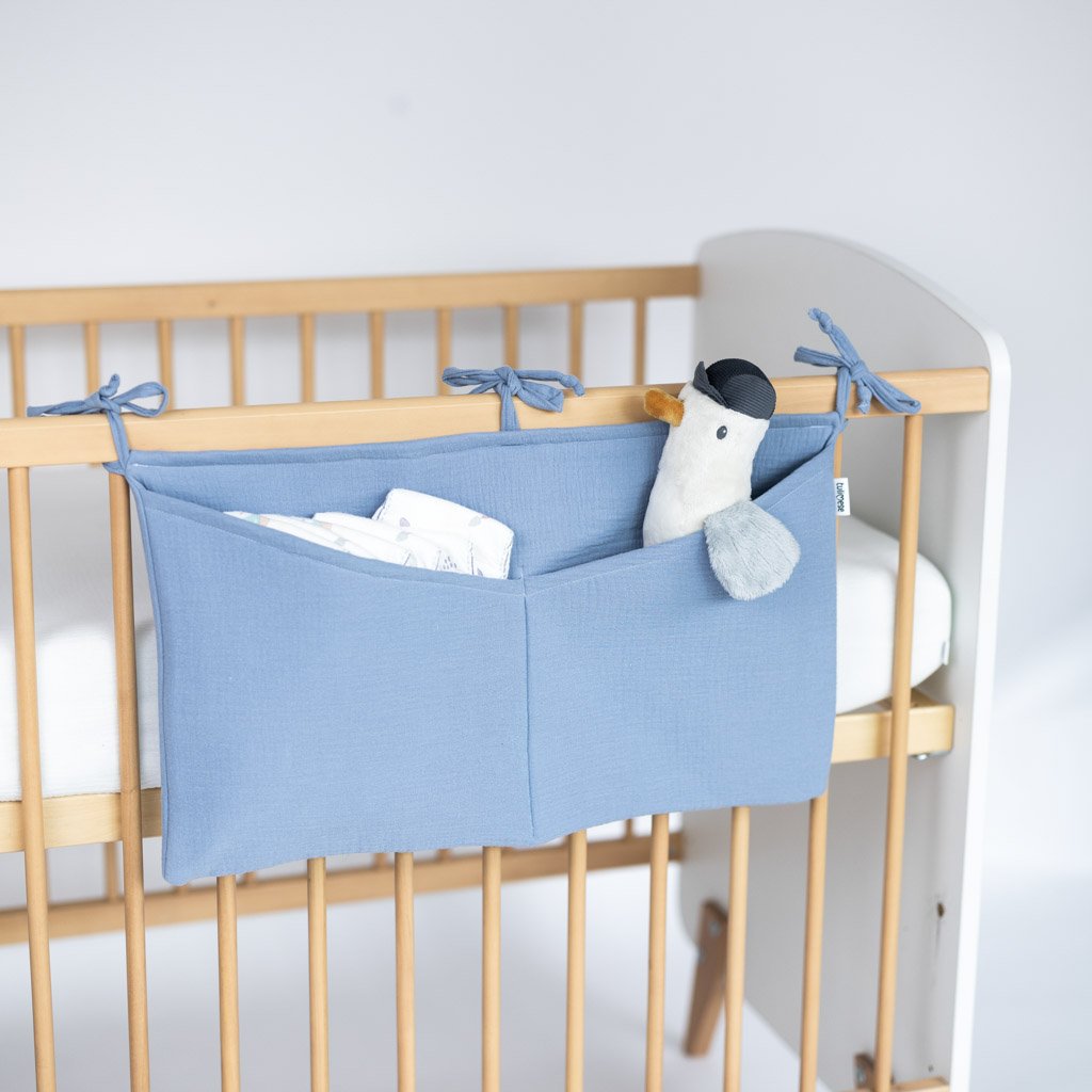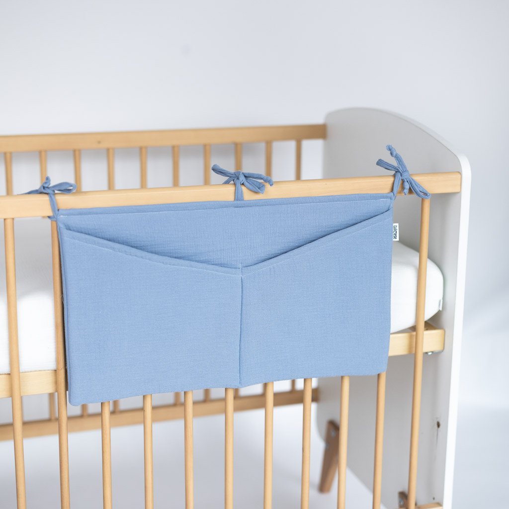 Praktický mušelínový kapsář v modré barvě. Kapsář je opatřen třemi tkanicemi. Je možné ho připevnit na postýlku pro miminko i na větší postel s dřevěnými bočnicemi. Kapsář je zpevněn vatelínovou výplní, kapsy dobře drží tvar a jsou velmi praktické na úschovu několika plenek, krémů, hraček, oblečení nebo knih.