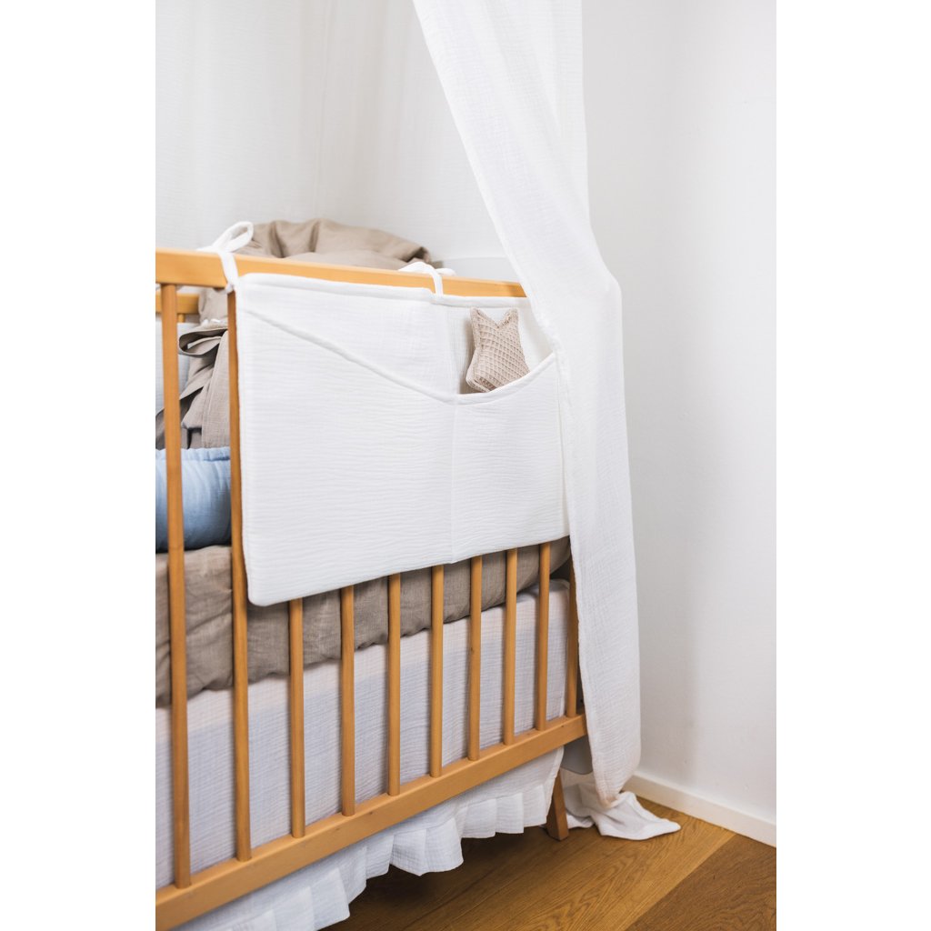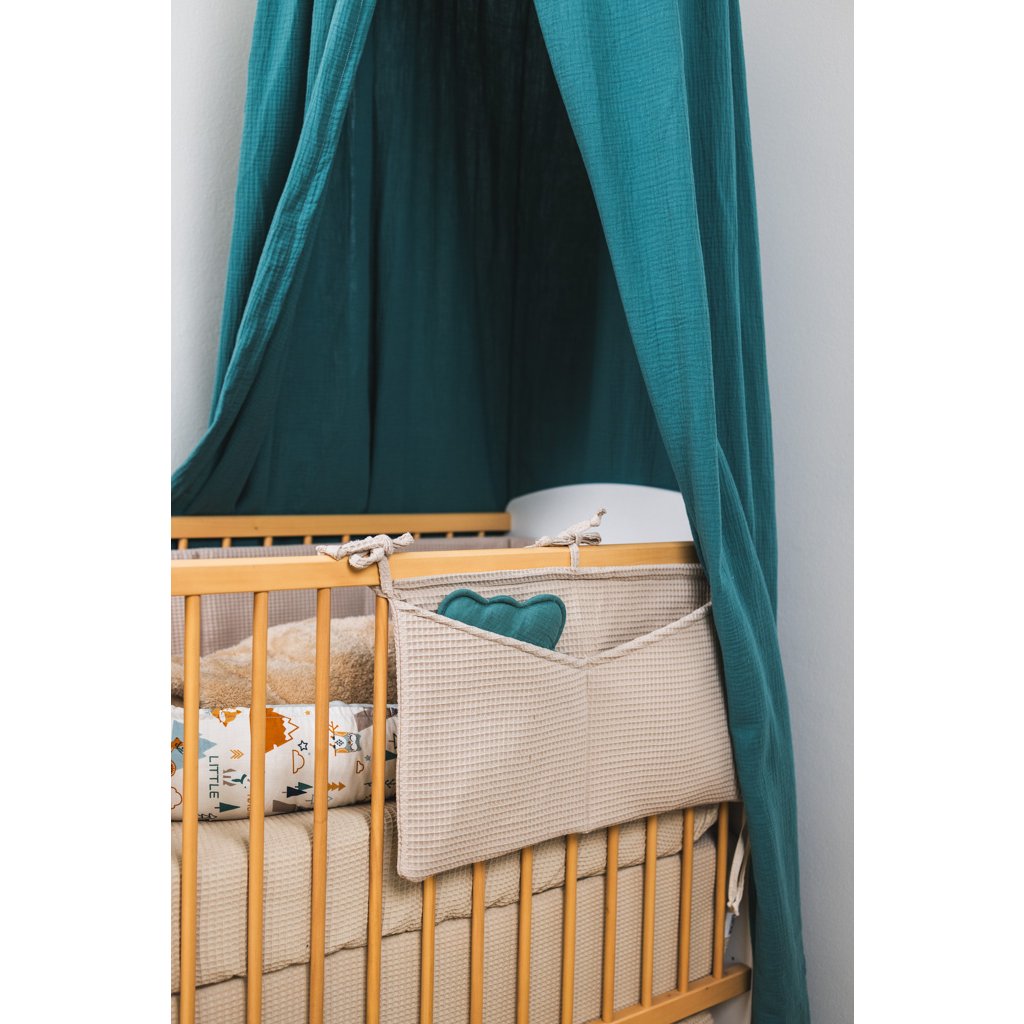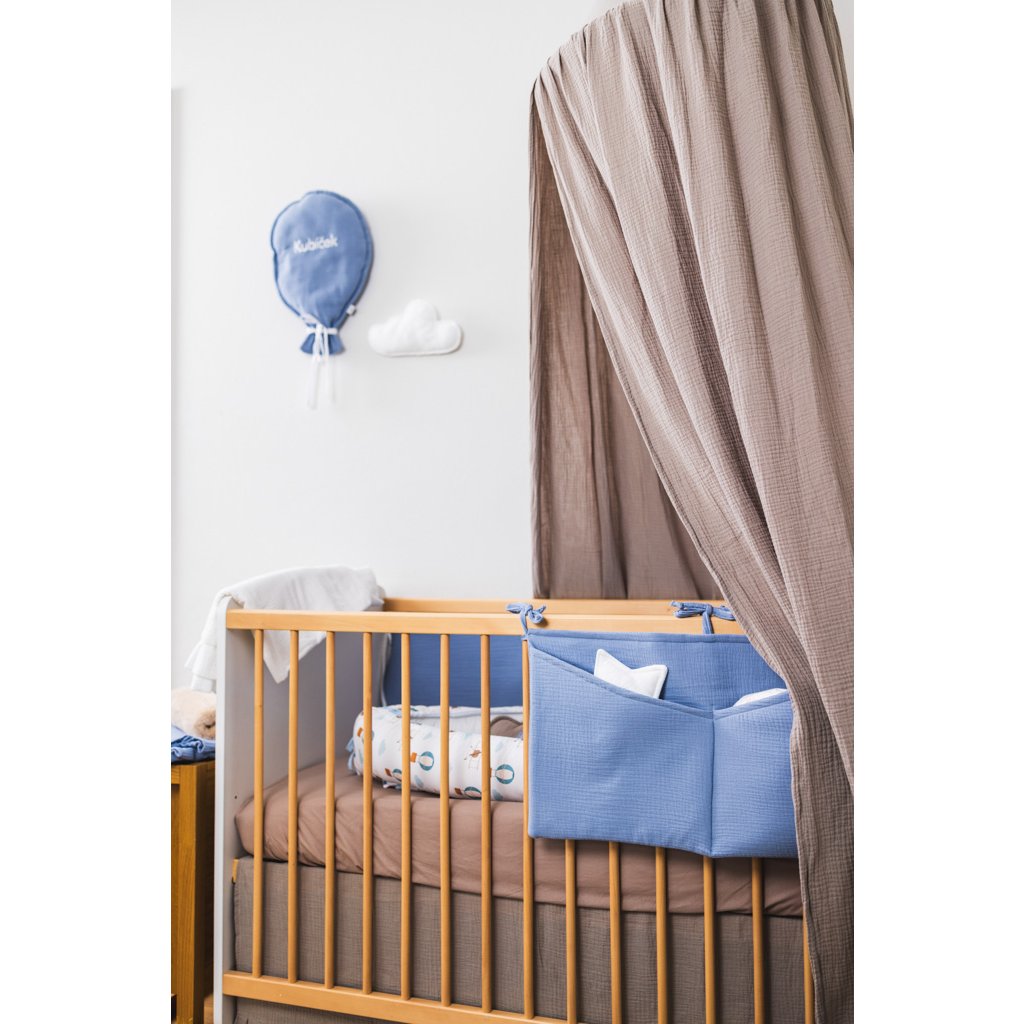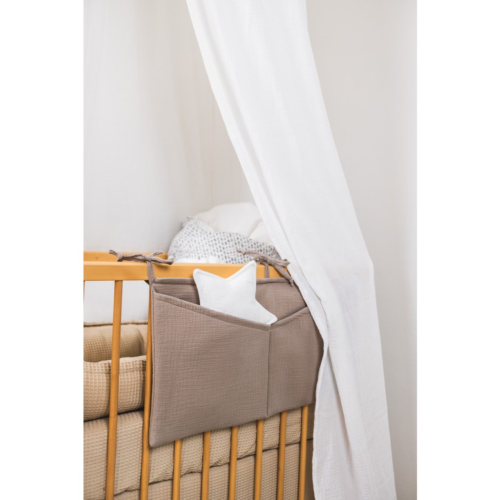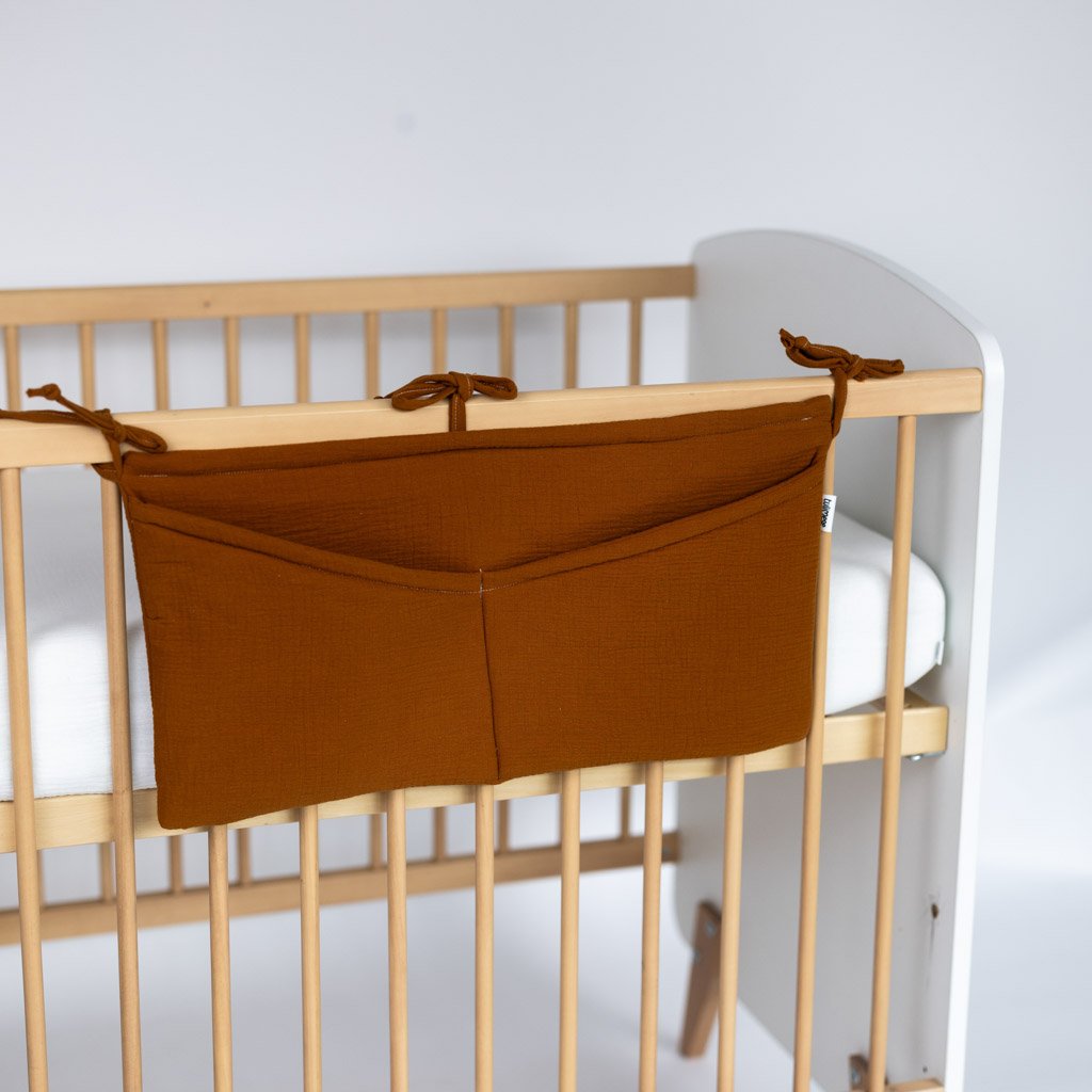 Praktický mušelínový kapsář ve skořicové barvě. Kapsář je opatřen třemi tkanicemi. Je možné ho připevnit na postýlku pro miminko i na větší postel s dřevěnými bočnicemi. Kapsář je zpevněn vatelínovou výplní, kapsy dobře drží tvar a jsou velmi praktické na úschovu několika plenek, krémů, hraček, oblečení nebo knih.