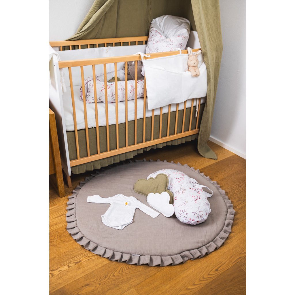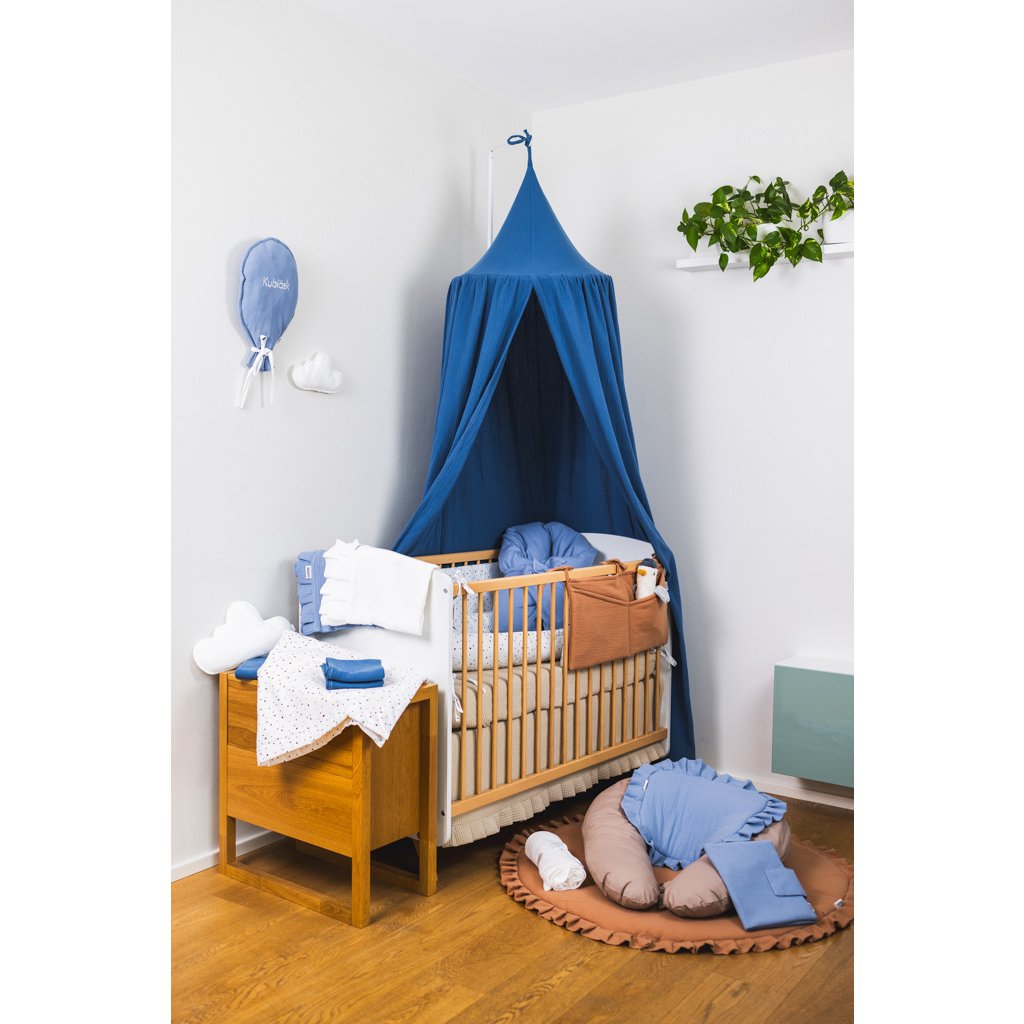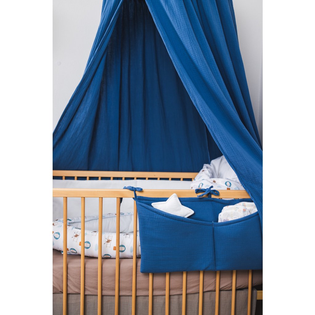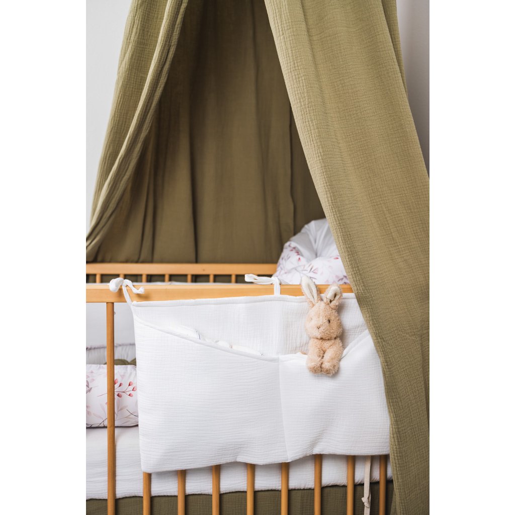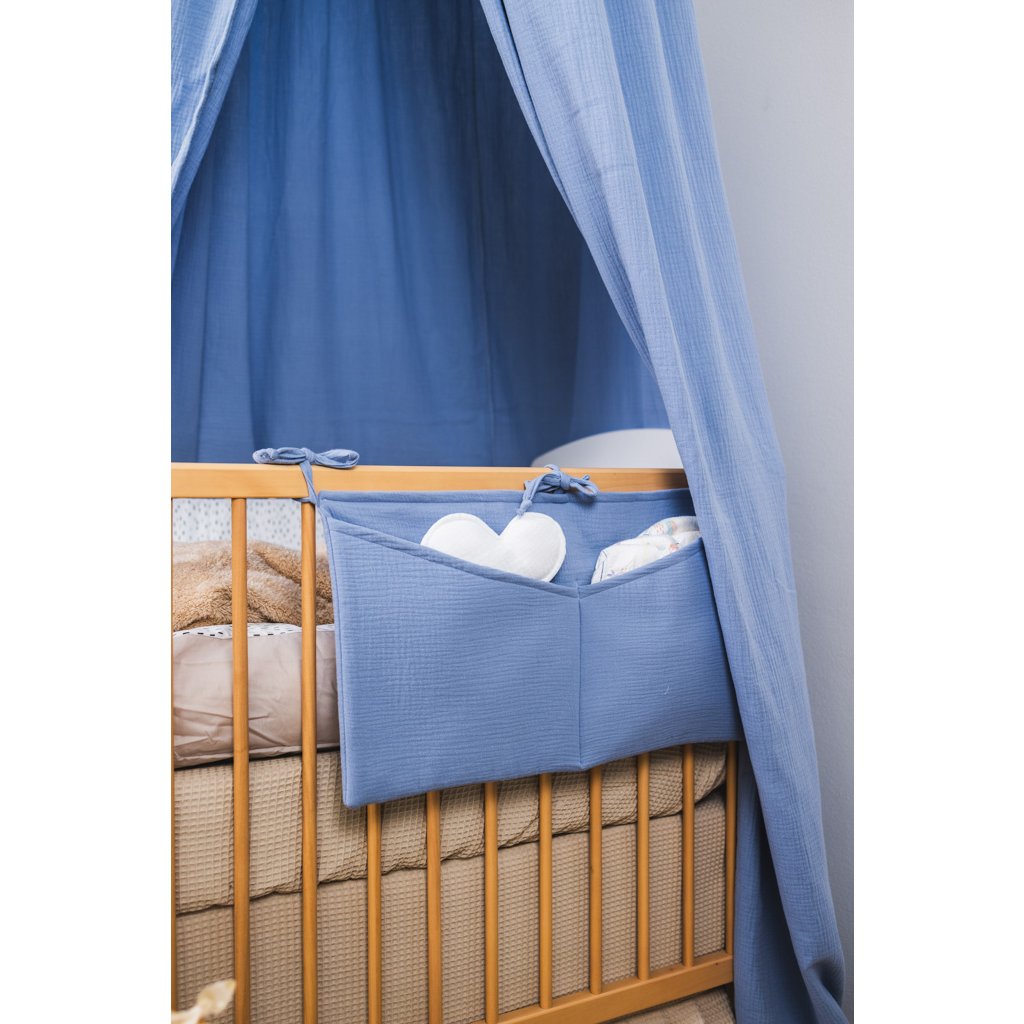Praktický mušelínový kapsář ve skořicové barvě. Kapsář je opatřen třemi tkanicemi. Je možné ho připevnit na postýlku pro miminko i na větší postel s dřevěnými bočnicemi. Kapsář je zpevněn vatelínovou výplní, kapsy dobře drží tvar a jsou velmi praktické na úschovu několika plenek, krémů, hraček, oblečení nebo knih.