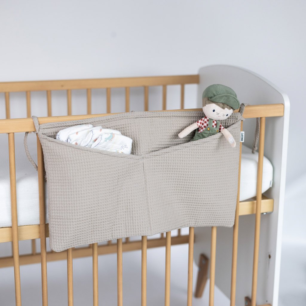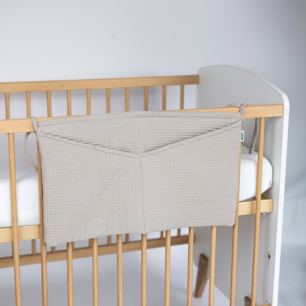 Praktický vaflový kapsář v béžové barvě. Kapsář je opatřen třemi tkanicemi. Je možné ho připevnit na postýlku pro miminko i na větší postel s dřevěnými bočnicemi. Kapsář je zpevněn vatelínovou výplní, kapsy dobře drží tvar a jsou velmi praktické na úschovu několika plenek, krémů, hraček, oblečení nebo knih.