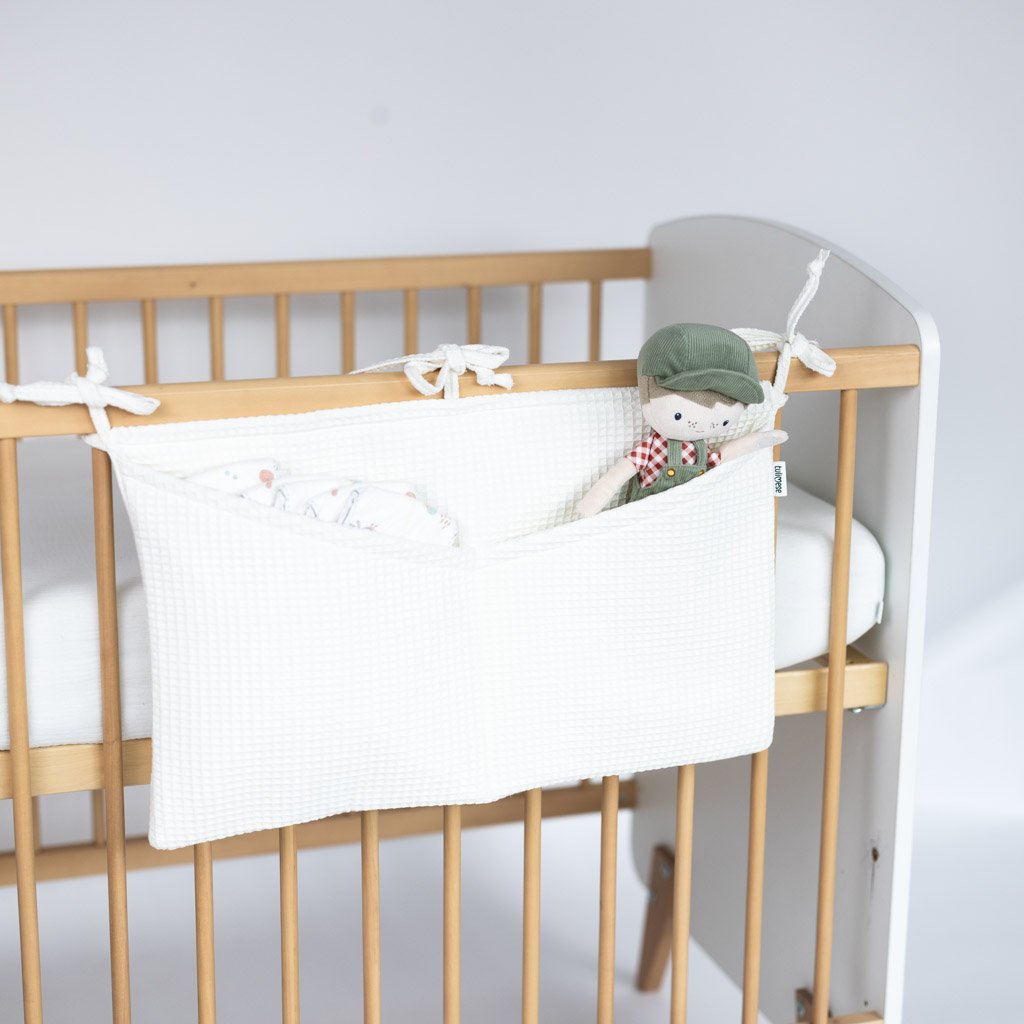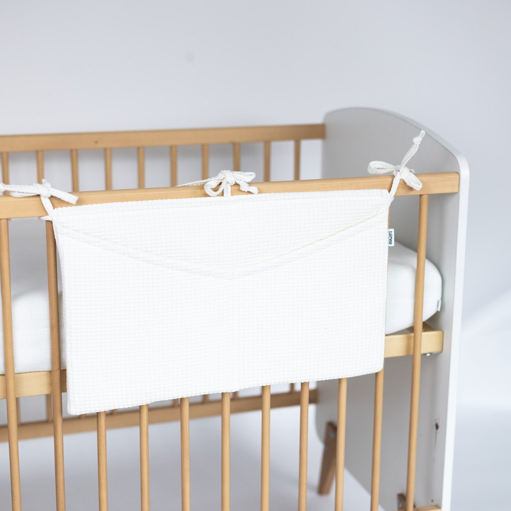 Praktický vaflový kapsář ve smetanové barvě. Kapsář je opatřen třemi tkanicemi. Je možné ho připevnit na postýlku pro miminko i na větší postel s dřevěnými bočnicemi. Kapsář je zpevněn vatelínovou výplní, kapsy dobře drží tvar a jsou velmi praktické na úschovu několika plenek, krémů, hraček, oblečení nebo knih.