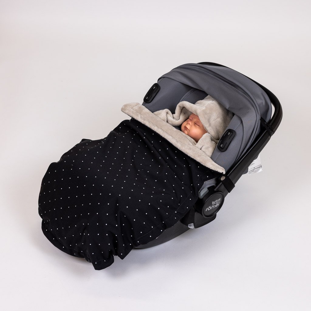 Je ideální jako doplněk do autosedačky a lze jej kombinovat s naší zavinovací dekou, která ještě znásobí tepelný komfort, a to se zachováním bezpečnosti při cestování - na fotce je zobrazen nánožník + kapucka, která je součástí zavinovací deky.