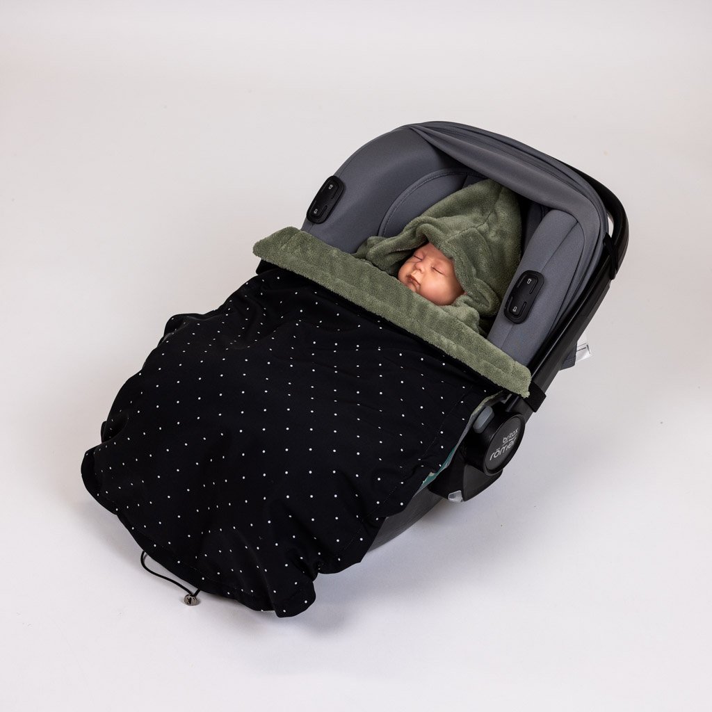 Je ideální jako doplněk do autosedačky a lze jej kombinovat s naší zavinovací dekou, která ještě znásobí tepelný komfort, a to se zachováním bezpečnosti při cestování - na fotce je zobrazen nánožník + kapucka, která je součástí zavinovací deky.