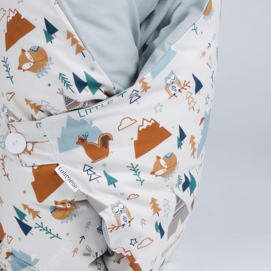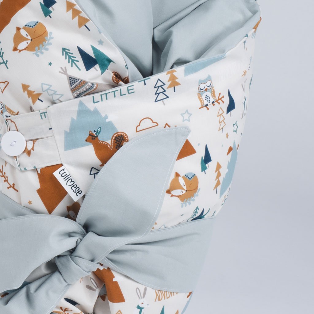 ZAPÍNÁNÍ NA KNOFLÍKY A MAŠLÍ – zavinovačka s třemi knoflíky doplněná o samostatnou zavazovací mašli pro ještě pevnější a bezpečnější zavinutí. Usnadňuje manipulaci s miminkem a zároveň krásně doplňuje vzhled celé zavinovačky.