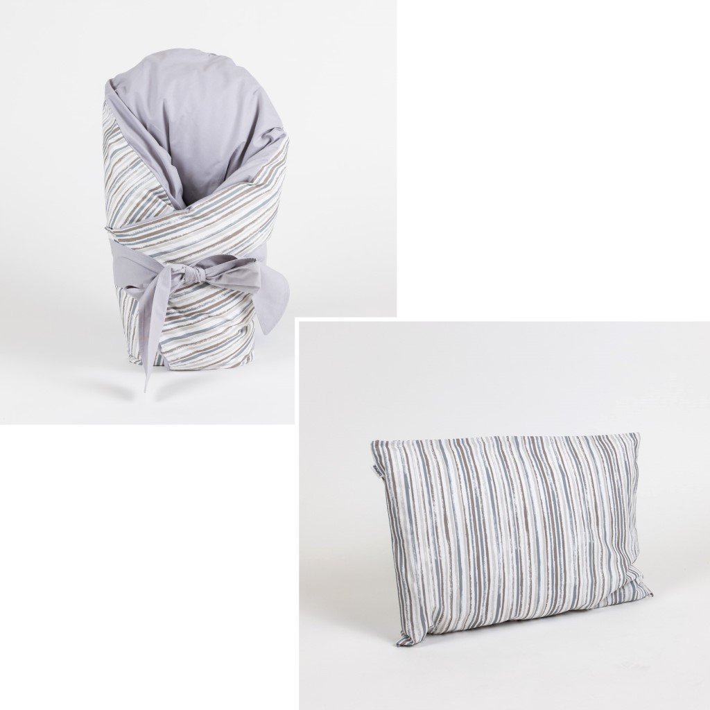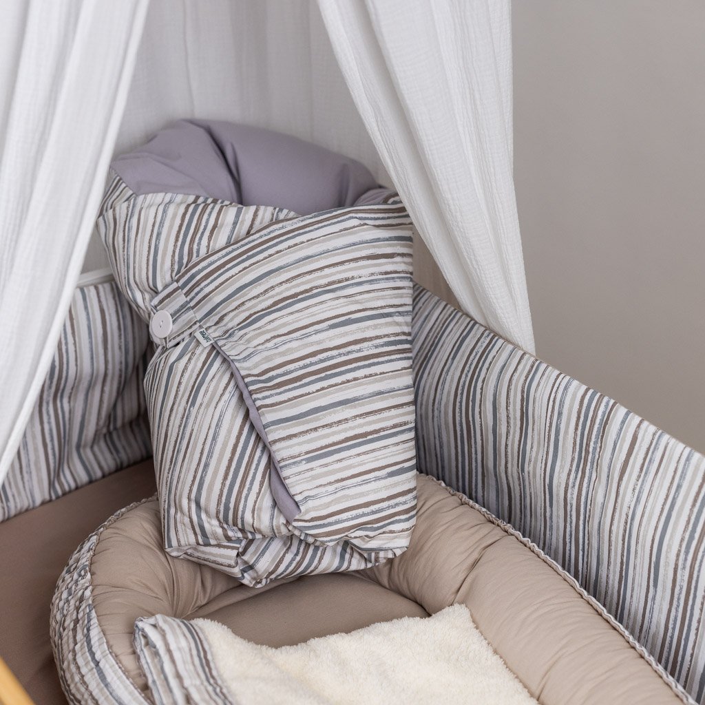 ZAPÍNÁNÍ NA KNOFLÍKY A MAŠLI + PODKLADNÍ POLŠTÁŘEK – polštářek zajišťuje zvýšenou oporu pod hlavičkou miminka, která pomáhá při rýmě nebo refluxu. Lze využít i jako měkkou podložku. Polštářek je vyplněn kvalitním husím peřím. Součástí této varianty je péřová výplň i povlak.