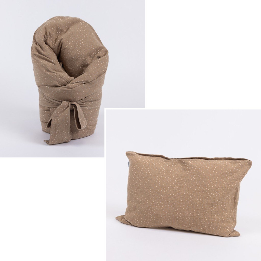 ZAPÍNÁNÍ NA KNOFLÍKY A MAŠLI + PODKLADNÍ POLŠTÁŘEK – polštářek zajišťuje zvýšenou oporu pod hlavičkou miminka, která pomáhá při rýmě nebo refluxu. Lze využít i jako měkkou podložku. Polštářek je vyplněn kvalitním husím peřím. Součástí této varianty je péřová výplň i povlak.