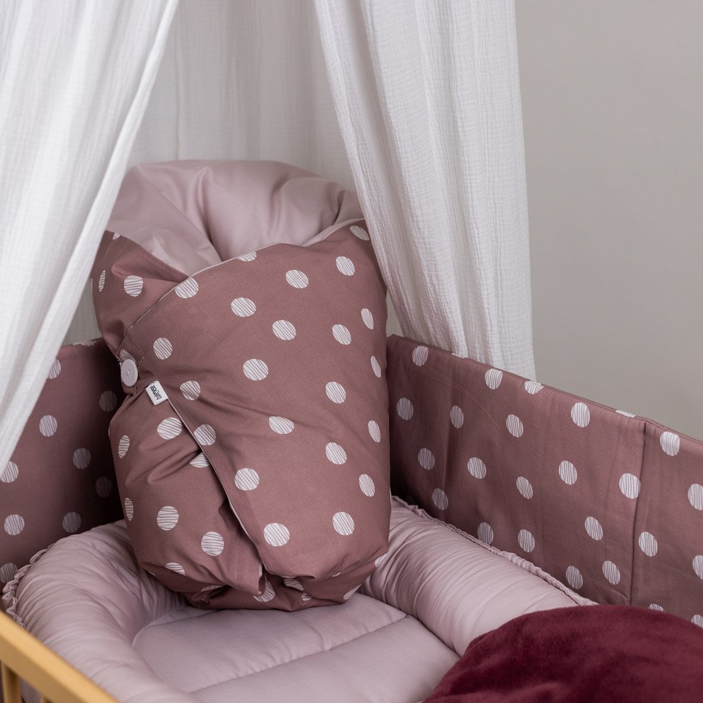 ZAPÍNÁNÍ NA KNOFLÍKY A MAŠLI + PODKLADNÍ POLŠTÁŘEK – polštářek zajišťuje zvýšenou oporu pod hlavičkou miminka, která pomáhá při rýmě nebo refluxu. Lze využít i jako měkkou podložku. Polštářek je vyplněn kvalitním husím peřím. Součástí této varianty je péřová výplň i povlak.