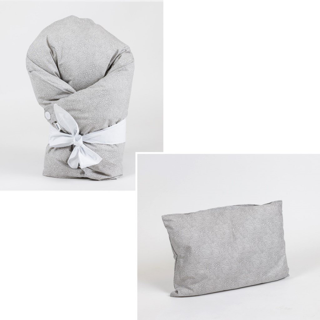 ZAPÍNÁNÍ NA KNOFLÍKY A MAŠLI + PODKLADNÍ POLŠTÁŘEK – polštářek zajišťuje zvýšenou oporu pod hlavičkou miminka, která pomáhá při rýmě nebo refluxu. Lze využít i jako měkkou podložku. Polštářek je vyplněn kvalitním husím peřím. Součástí této varianty je péřová výplň i povlak.