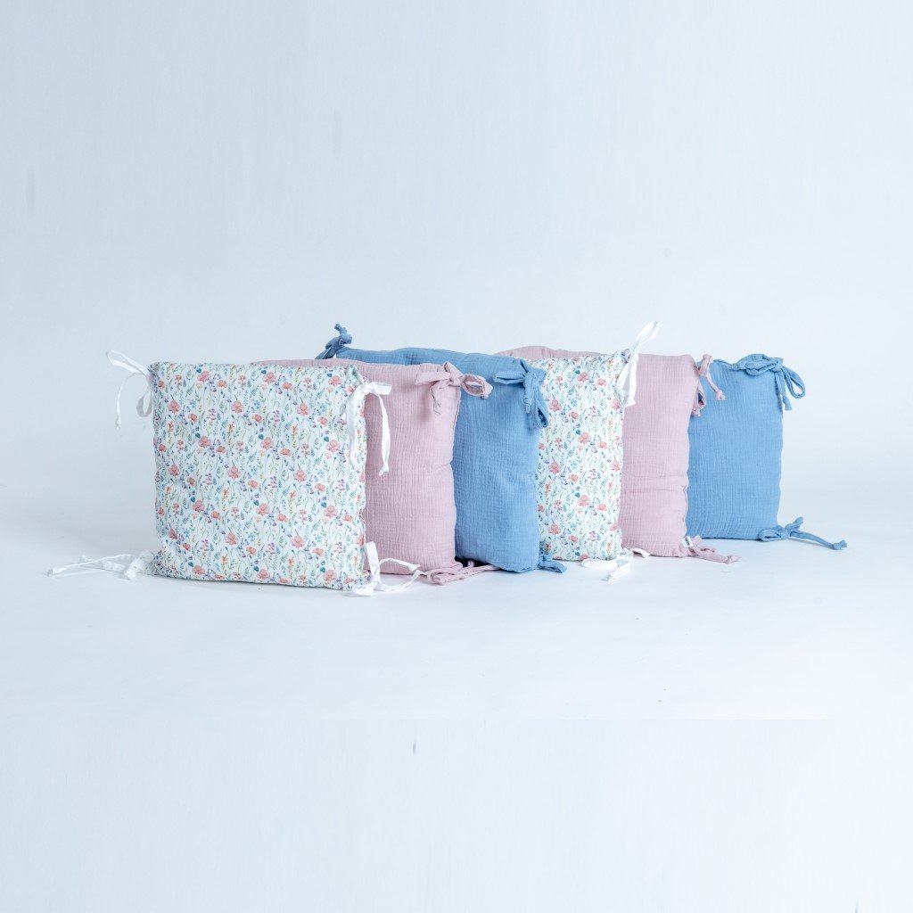 - Polštářkový mantinel je součástí barevně sladěné sady výrobků pro miminko SADA VLČÍ MÁK a SADA JEDNOBAREVNÁ MUŠELÍNOVÁ.