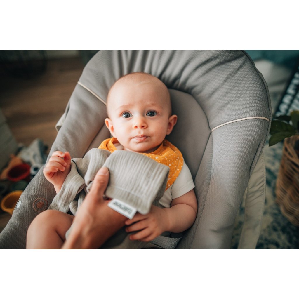 Jemný mušelínový slintáček zachytí odříhnutí v období kojení i sliny v období růstu prvních zoubků. Chrání oděv miminka před ušpiněním. Lze ho používat jako módní doplněk po celý den, je vhodný na cesty i jako lehká ochrana proti chladnému počasí.
