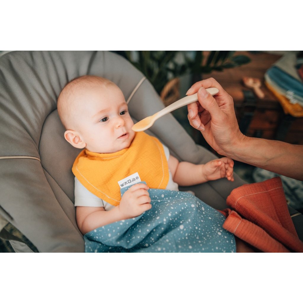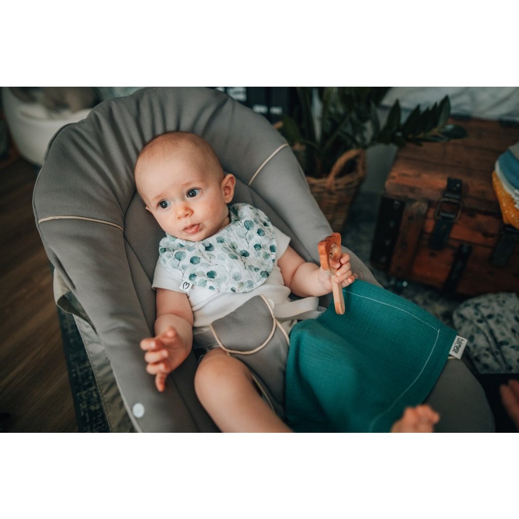 Jemný mušelínový slintáček zachytí odříhnutí v období kojení i sliny v období růstu prvních zoubků. Chrání oděv miminka před ušpiněním. Lze ho používat jako módní doplněk po celý den, je vhodný na cesty i jako lehká ochrana proti chladnému počasí.