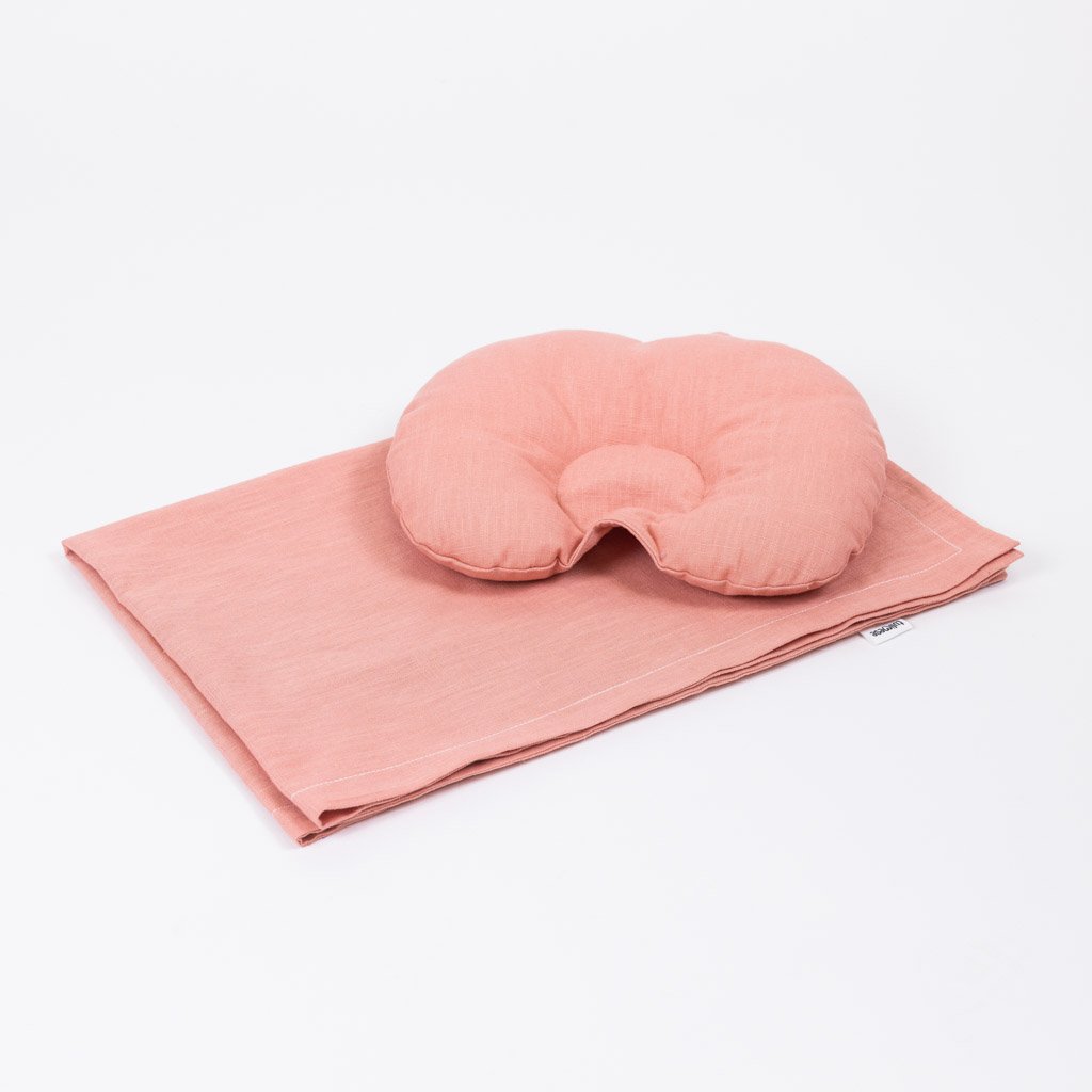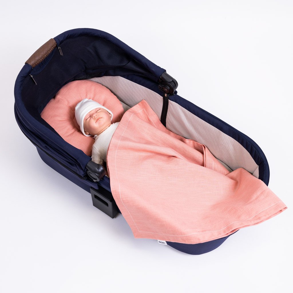 Prodyšná a odolná lněná souprava do kočárku. Souprava obsahuje stabilizační polštářek ala podhlavníček, který pomáhá zafixovat hlavičku miminka ve správné poloze a zabraňuje jednostrannému zploštění hlavičky. Je vhodný nejen do kočárku, ale i do hnízdeček, postýlek i autosedaček, kde tlumí případné nárazy. Podhlavníček se skládá z vyvýšeného půlkruhu kolem hlavičky a plochého vnitřního kolečka pod hlavičkou a krkem miminka. Mušelínová deka je extra jemná a vzdušná. Vhodná hlavně jako lehká přikrývka v horkém létě. Miminko chrání před průvanem, hlukem a přímým světlem. K soupravě do kočárku doporučujeme dokoupit i mušelínové nebo lněné prostěradlo.