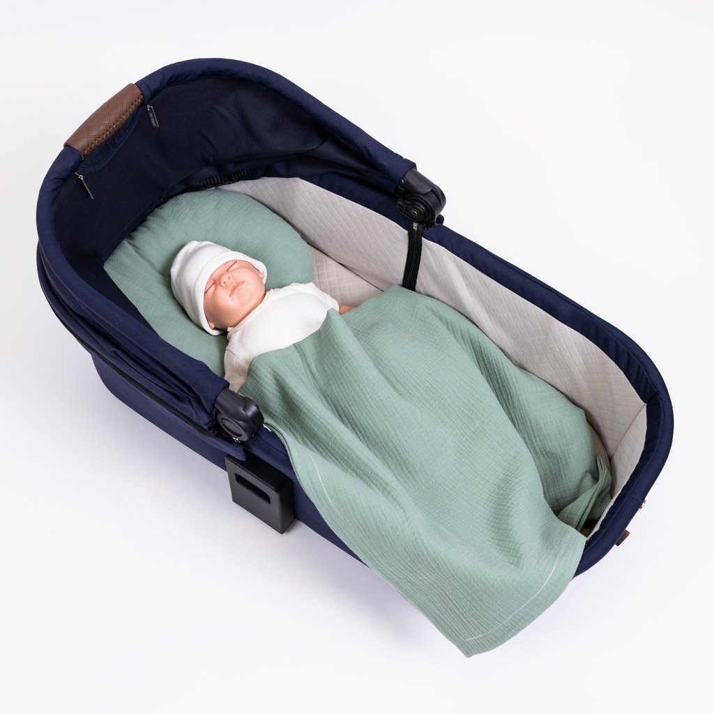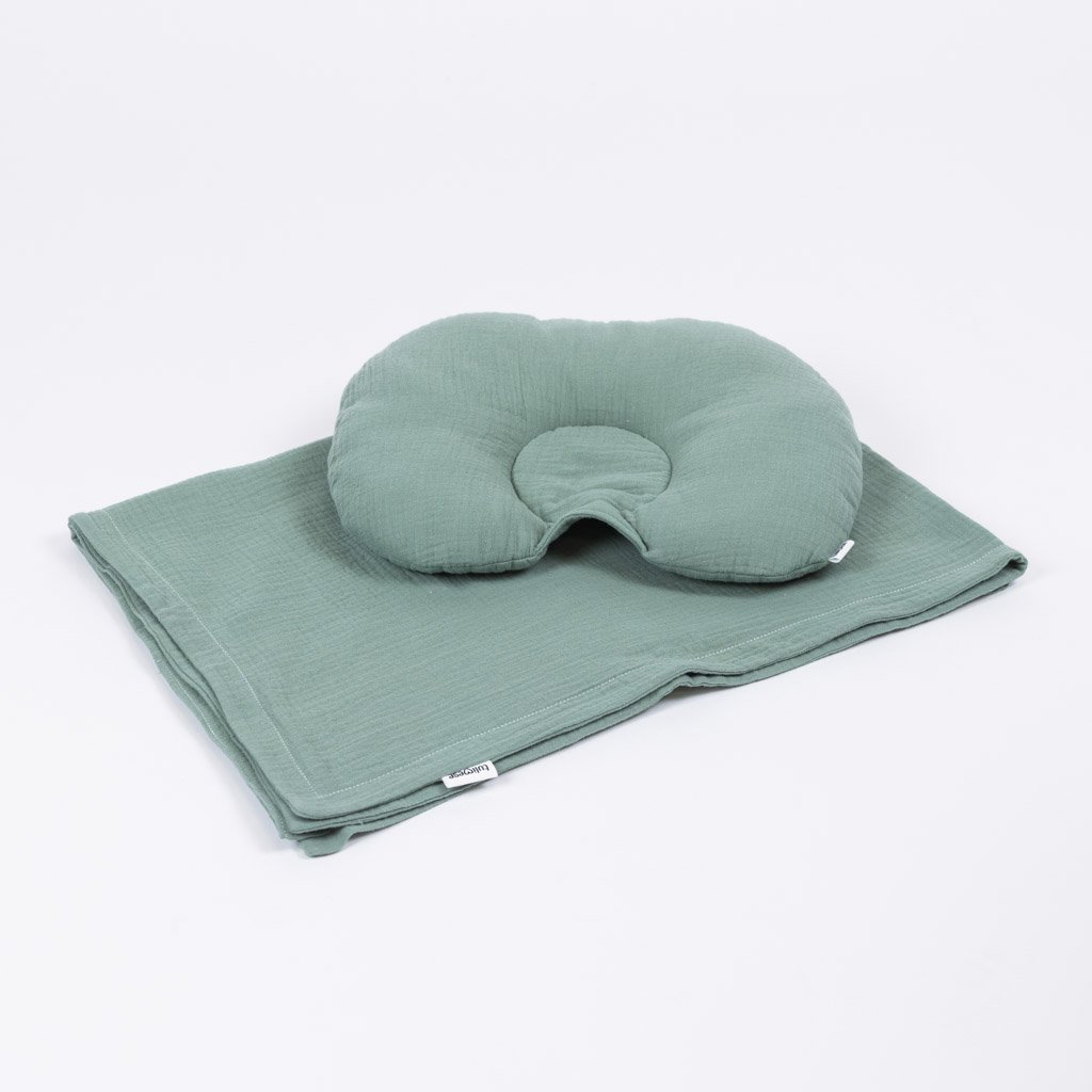 Jemná mušelínová souprava do kočárku. Souprava obsahuje stabilizační polštářek ala podhlavníček, který pomáhá zafixovat hlavičku miminka ve správné poloze a zabraňuje jednostrannému zploštění hlavičky. Je vhodný nejen do kočárku, ale i do hnízdeček, postýlek i autosedaček, kde tlumí případné nárazy. Podhlavníček se skládá z vyvýšeného půlkruhu kolem hlavičky a plochého vnitřního kolečka pod hlavičkou a krkem miminka. Mušelínová deka je extra jemná a vzdušná. Vhodná hlavně jako lehká přikrývka v horkém létě. Miminko chrání před průvanem, hlukem a přímým světlem. K soupravě do kočárku doporučujeme dokoupit i mušelínové prostěradlo.