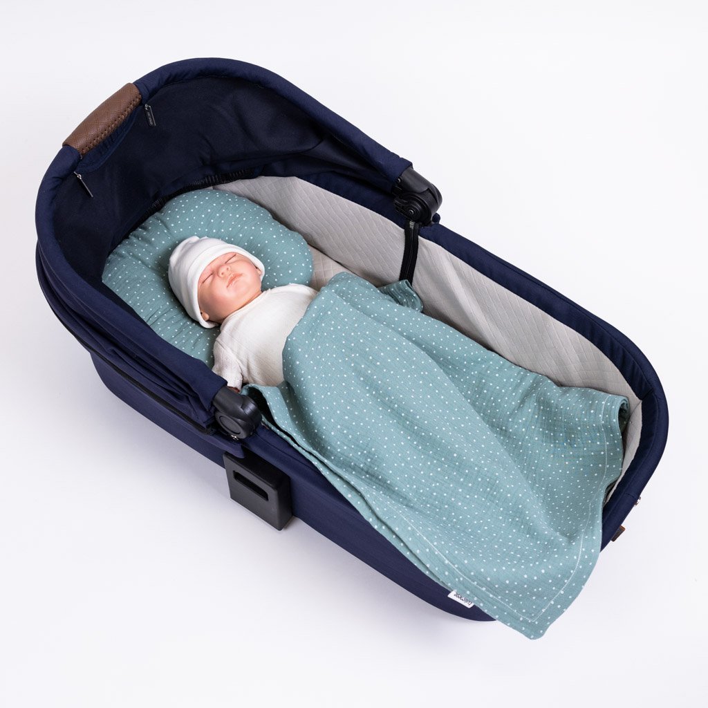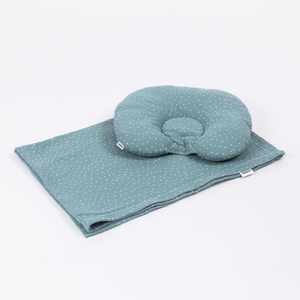 Jemná mušelínová souprava do kočárku. Souprava obsahuje stabilizační polštářek ala podhlavníček, který pomáhá zafixovat hlavičku miminka ve správné poloze a zabraňuje jednostrannému zploštění hlavičky. Je vhodný nejen do kočárku, ale i do hnízdeček, postýlek i autosedaček, kde tlumí případné nárazy. Podhlavníček se skládá z vyvýšeného půlkruhu kolem hlavičky a plochého vnitřního kolečka pod hlavičkou a krkem miminka. Mušelínová deka je extra jemná a vzdušná. Vhodná hlavně jako lehká přikrývka v horkém létě. Miminko chrání před průvanem, hlukem a přímým světlem. K soupravě do kočárku doporučujeme dokoupit i mušelínové prostěradlo.