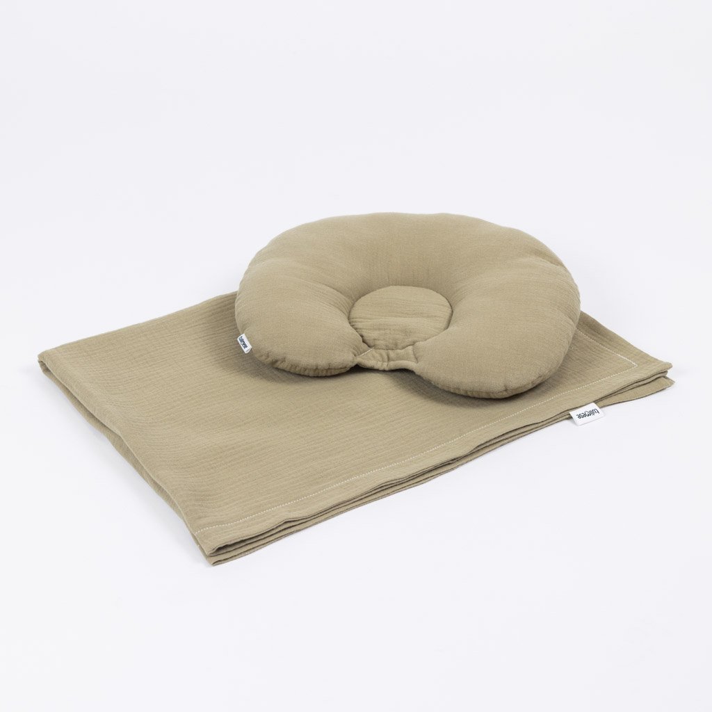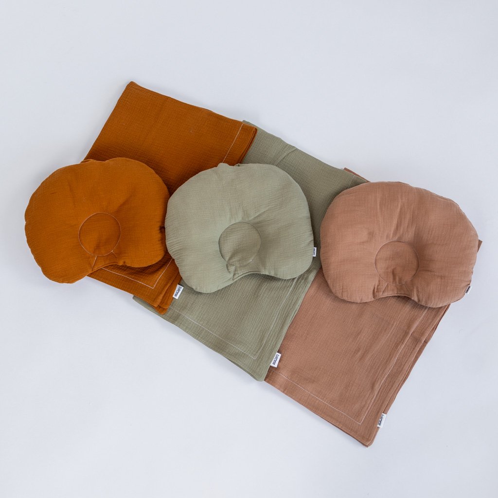 Jemná mušelínová souprava do kočárku. Souprava obsahuje stabilizační polštářek ala podhlavníček, který pomáhá zafixovat hlavičku miminka ve správné poloze a zabraňuje jednostrannému zploštění hlavičky. Je vhodný nejen do kočárku, ale i do hnízdeček, postýlek i autosedaček, kde tlumí případné nárazy. Podhlavníček se skládá z vyvýšeného půlkruhu kolem hlavičky a plochého vnitřního kolečka pod hlavičkou a krkem miminka. Mušelínová deka je extra jemná a vzdušná. Vhodná hlavně jako lehká přikrývka v horkém létě. Miminko chrání před průvanem, hlukem a přímým světlem. K soupravě do kočárku doporučujeme dokoupit i mušelínové prostěradlo.
