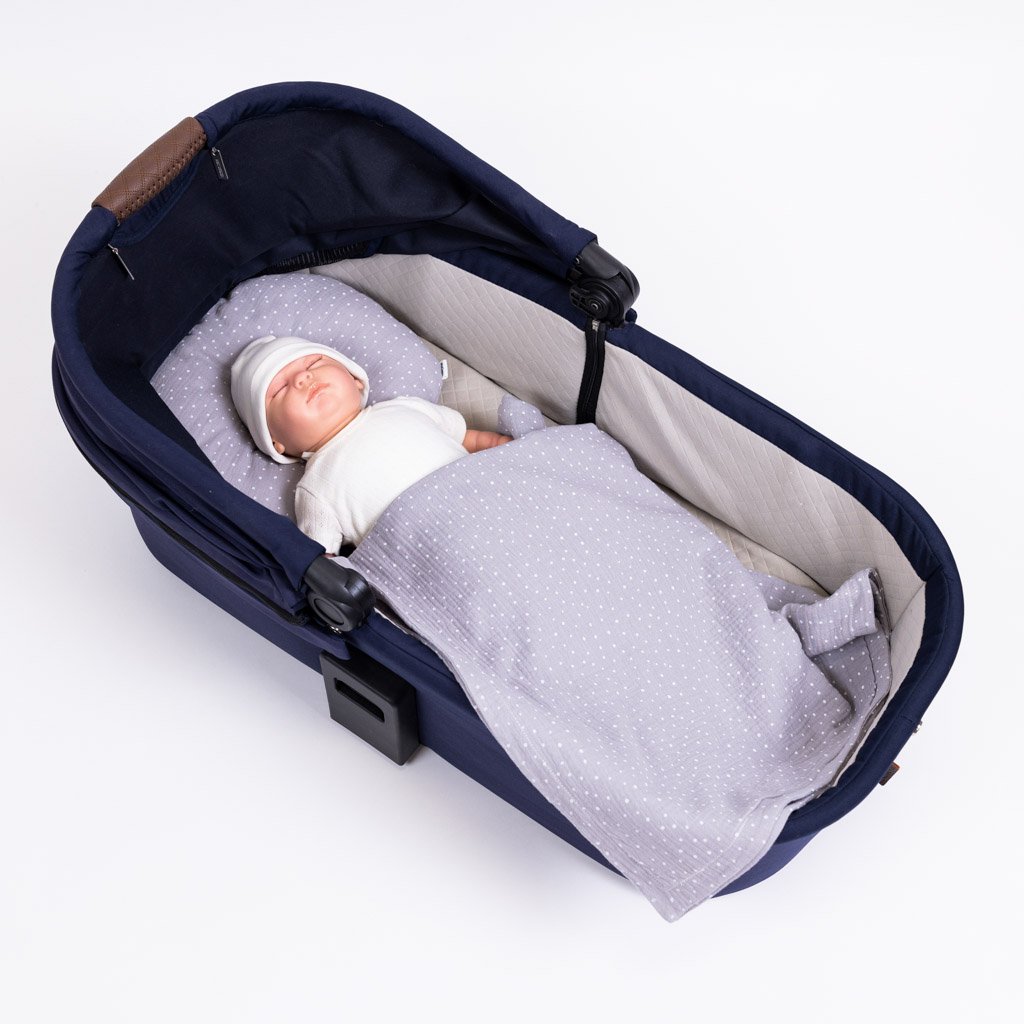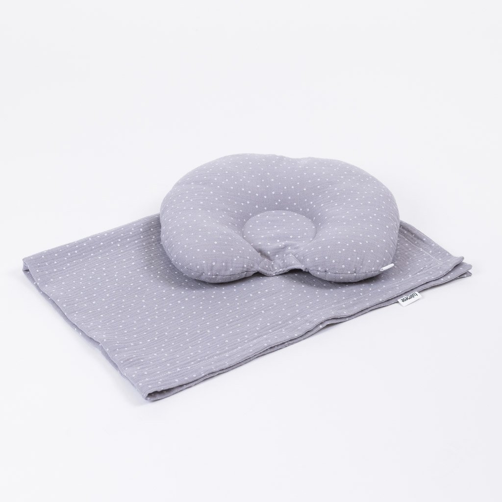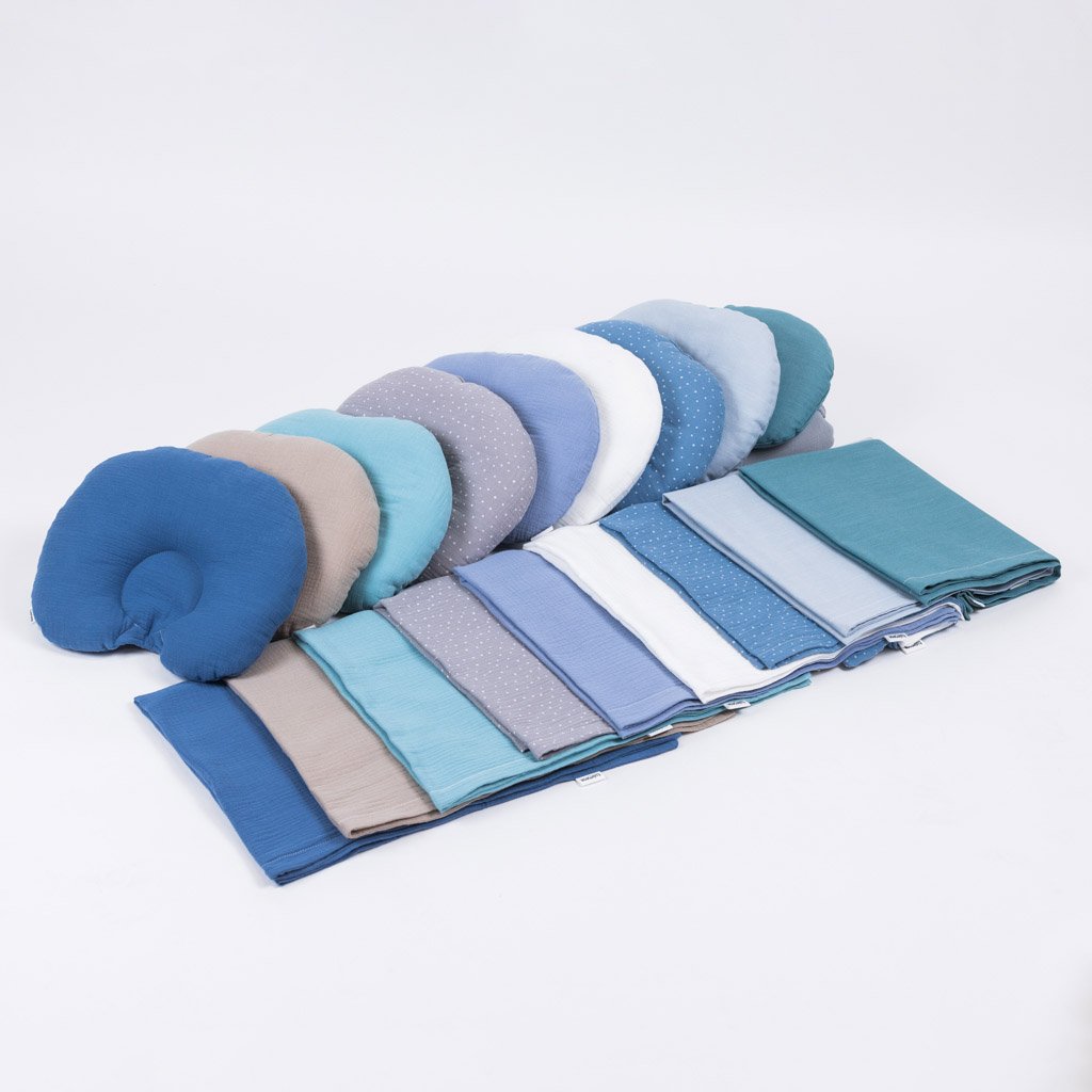 Jemná mušelínová souprava do kočárku. Souprava obsahuje stabilizační polštářek ala podhlavníček, který pomáhá zafixovat hlavičku miminka ve správné poloze a zabraňuje jednostrannému zploštění hlavičky. Je vhodný nejen do kočárku, ale i do hnízdeček, postýlek i autosedaček, kde tlumí případné nárazy. Podhlavníček se skládá z vyvýšeného půlkruhu kolem hlavičky a plochého vnitřního kolečka pod hlavičkou a krkem miminka. Mušelínová deka je extra jemná a vzdušná. Vhodná hlavně jako lehká přikrývka v horkém létě. Miminko chrání před průvanem, hlukem a přímým světlem. K soupravě do kočárku doporučujeme dokoupit i mušelínové prostěradlo.
