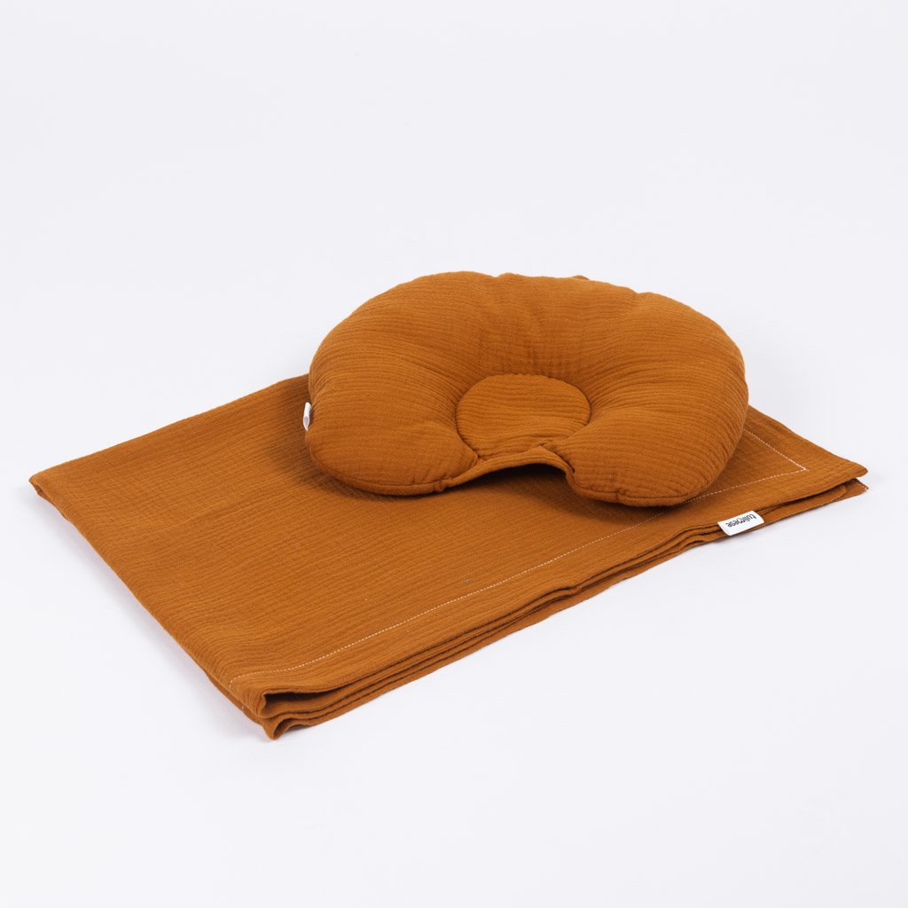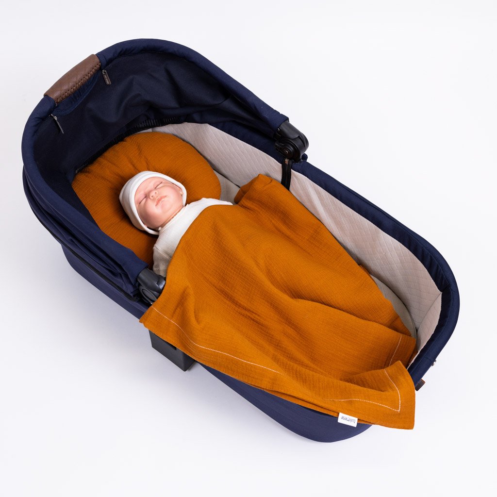 Jemná mušelínová souprava do kočárku. Souprava obsahuje stabilizační polštářek ala podhlavníček, který pomáhá zafixovat hlavičku miminka ve správné poloze a zabraňuje jednostrannému zploštění hlavičky. Je vhodný nejen do kočárku, ale i do hnízdeček, postýlek i autosedaček, kde tlumí případné nárazy. Podhlavníček se skládá z vyvýšeného půlkruhu kolem hlavičky a plochého vnitřního kolečka pod hlavičkou a krkem miminka. Mušelínová deka je extra jemná a vzdušná. Vhodná hlavně jako lehká přikrývka v horkém létě. Miminko chrání před průvanem, hlukem a přímým světlem. K soupravě do kočárku doporučujeme dokoupit i mušelínové prostěradlo.