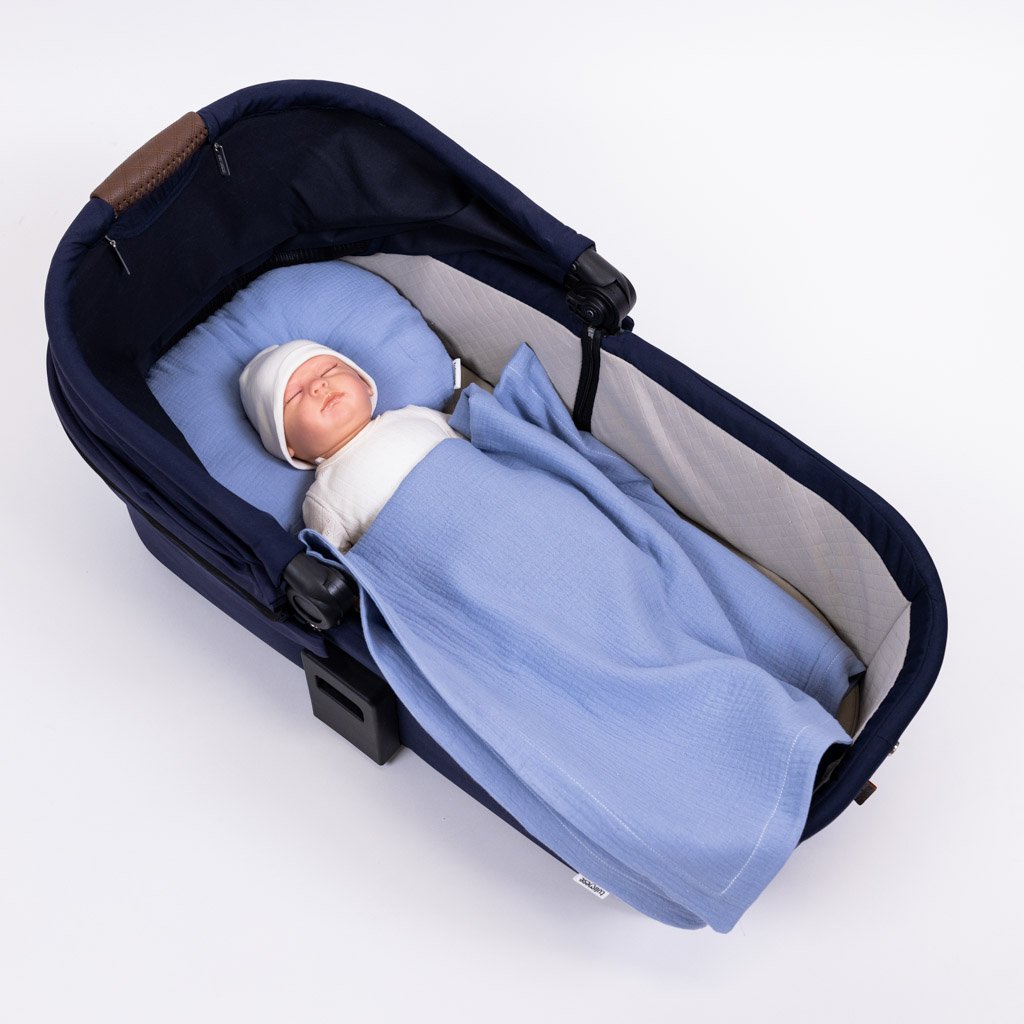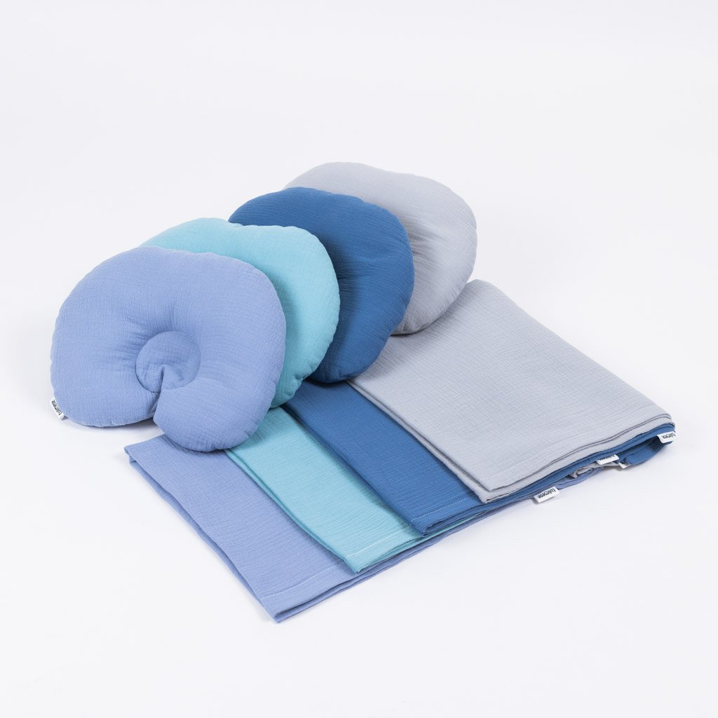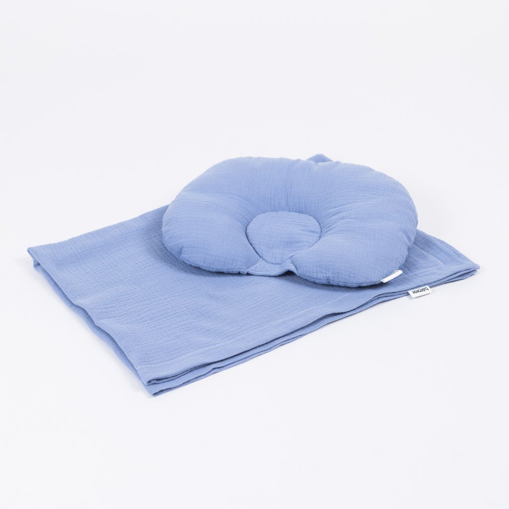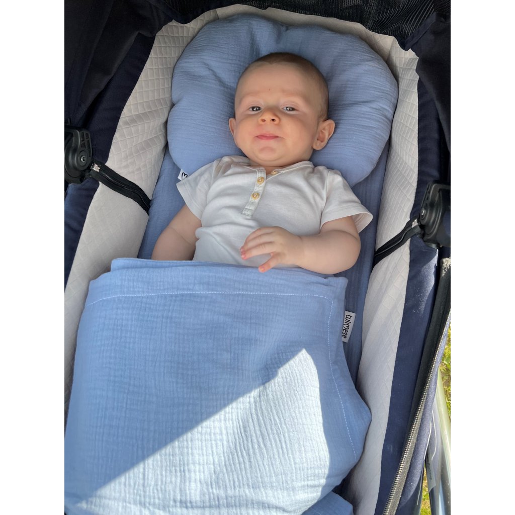 Jemná mušelínová souprava do kočárku. Souprava obsahuje stabilizační polštářek ala podhlavníček, který pomáhá zafixovat hlavičku miminka ve správné poloze a zabraňuje jednostrannému zploštění hlavičky. Je vhodný nejen do kočárku, ale i do hnízdeček, postýlek i autosedaček, kde tlumí případné nárazy. Podhlavníček se skládá z vyvýšeného půlkruhu kolem hlavičky a plochého vnitřního kolečka pod hlavičkou a krkem miminka. Mušelínová deka je extra jemná a vzdušná. Vhodná hlavně jako lehká přikrývka v horkém létě. Miminko chrání před průvanem, hlukem a přímým světlem. K soupravě do kočárku doporučujeme dokoupit i mušelínové prostěradlo.