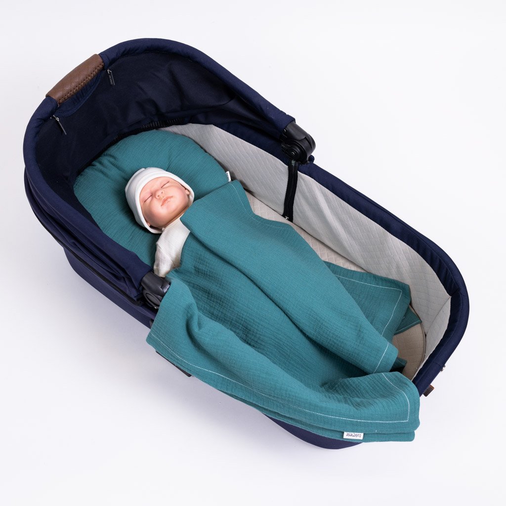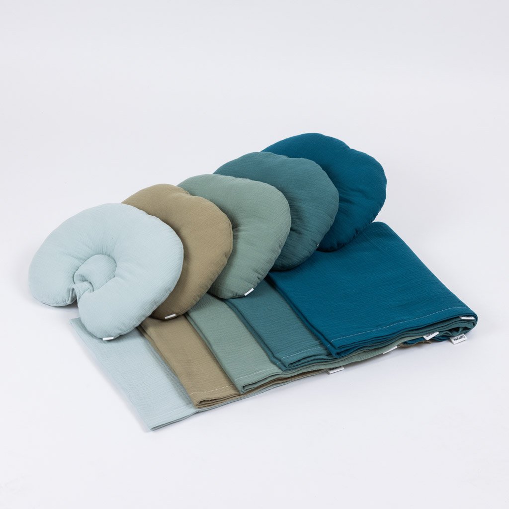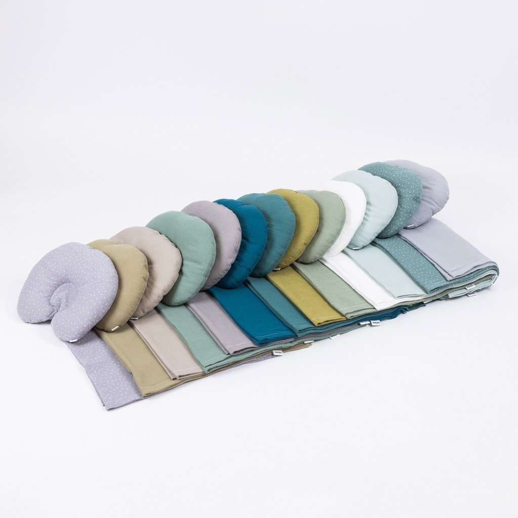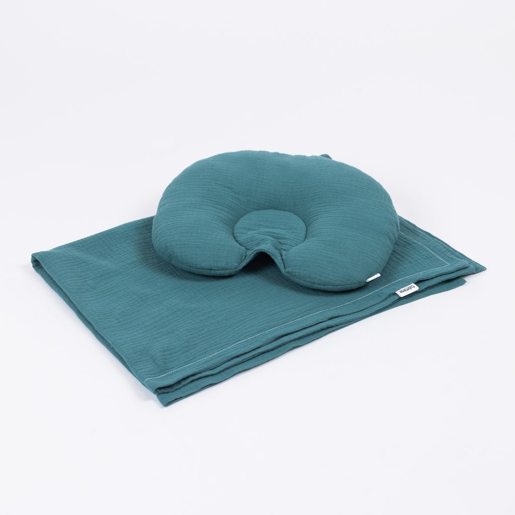 Jemná mušelínová souprava do kočárku. Souprava obsahuje stabilizační polštářek ala podhlavníček, který pomáhá zafixovat hlavičku miminka ve správné poloze a zabraňuje jednostrannému zploštění hlavičky. Je vhodný nejen do kočárku, ale i do hnízdeček, postýlek i autosedaček, kde tlumí případné nárazy. Podhlavníček se skládá z vyvýšeného půlkruhu kolem hlavičky a plochého vnitřního kolečka pod hlavičkou a krkem miminka. Mušelínová deka je extra jemná a vzdušná. Vhodná hlavně jako lehká přikrývka v horkém létě. Miminko chrání před průvanem, hlukem a přímým světlem. K soupravě do kočárku doporučujeme dokoupit i mušelínové prostěradlo.