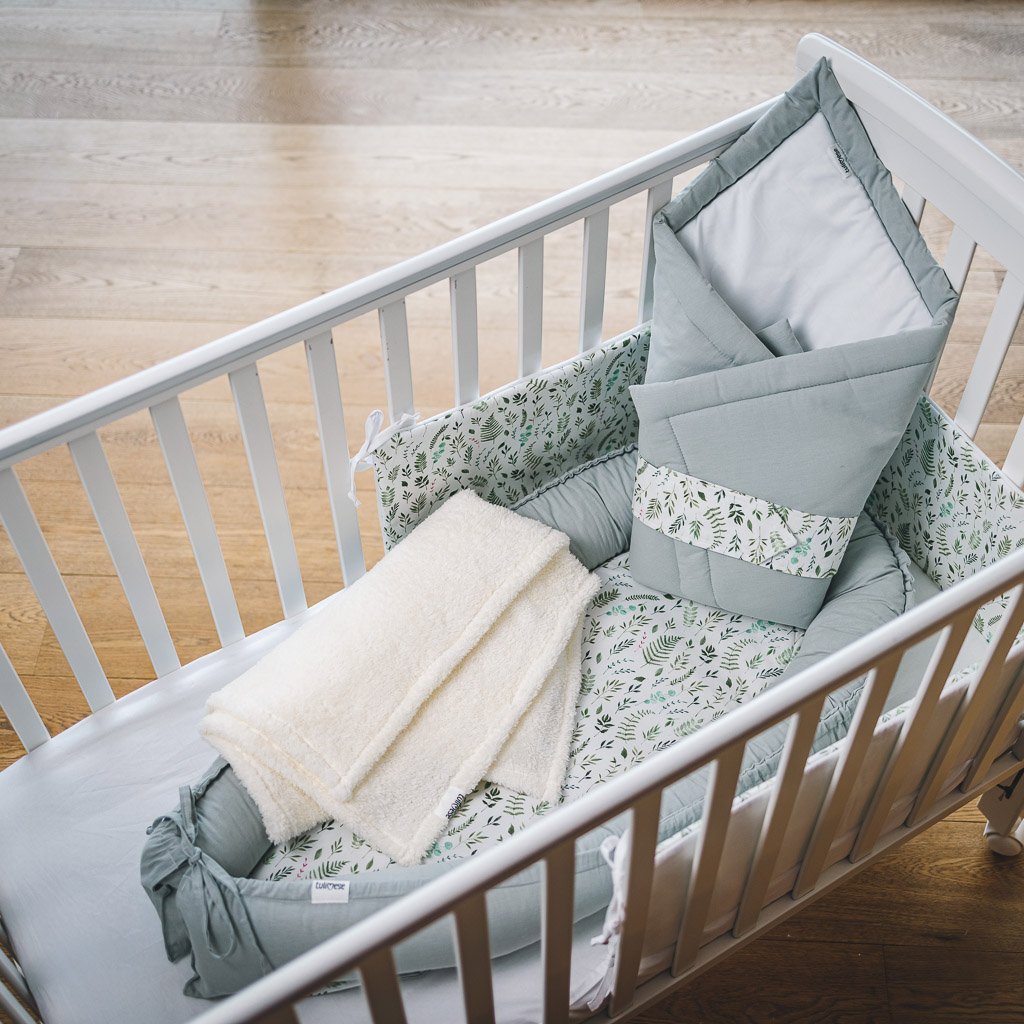 - mantinel zakryje polovinu obvodu postýlky. Buď tři strany kolem hlavičky miminka, nebo jednu dlouhou a jednu krátkou stranu postýlky