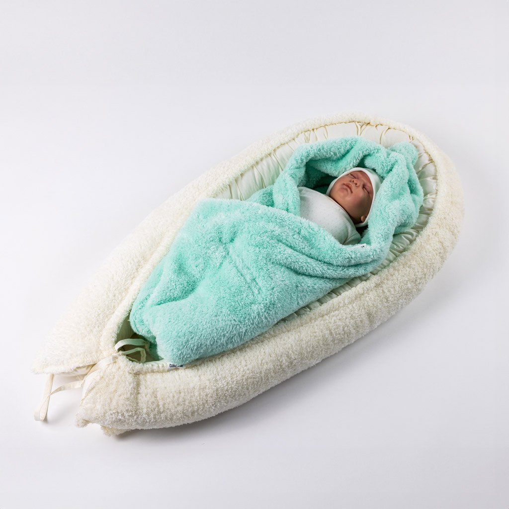 - Zavinovací deku jsme ušili z heboučkého wellsoftu v mentolovém odstínu.